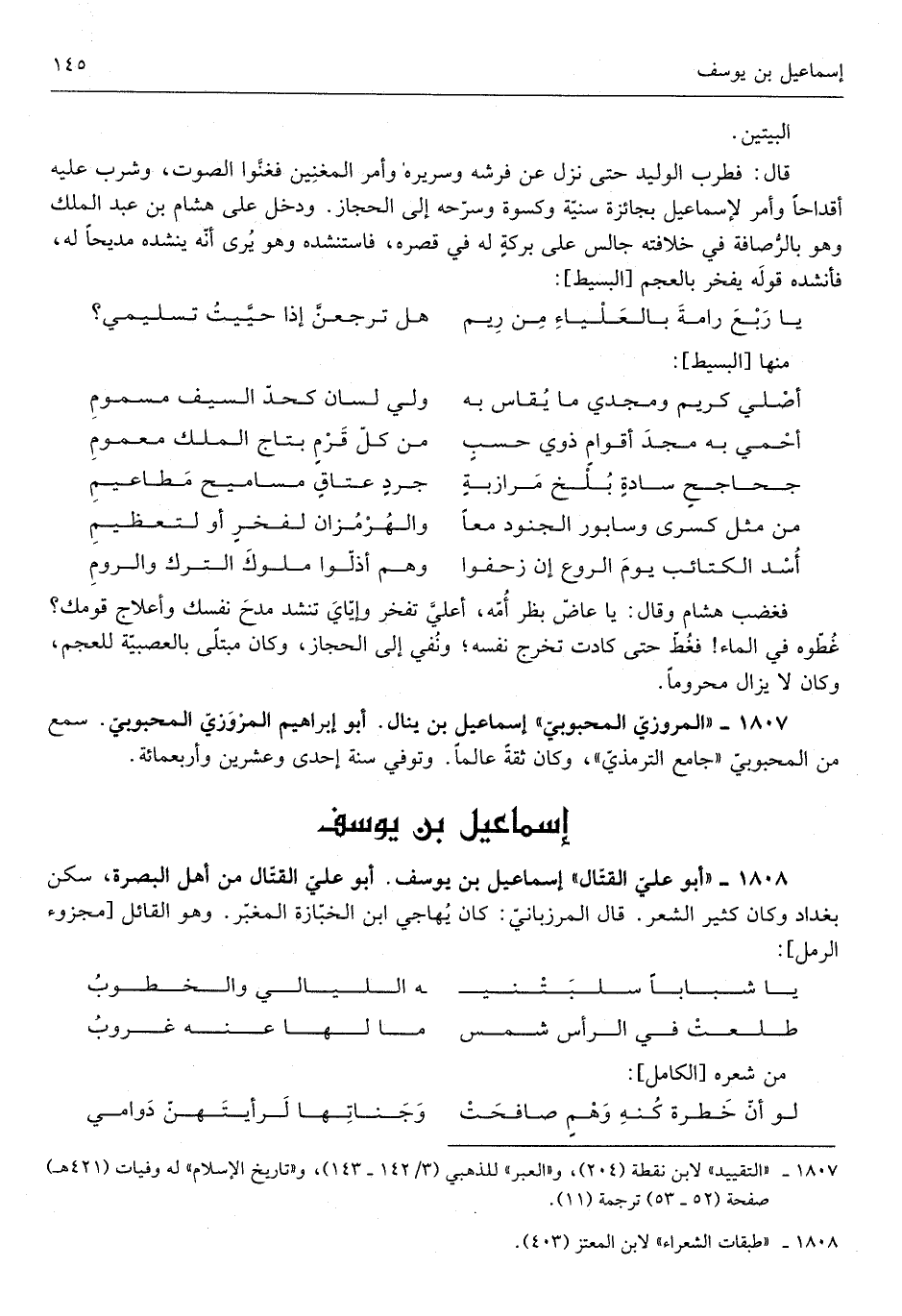 قَالَ فطرب الْوَلِيد حَتَّى نزل عَن فرشه وسريره وَأمر المغنين فغنوا الصَّوْت وَشرب عَلَيْهِ أقداحاً وَأمر لإسماعيل بجائزة سنية وَكِسْوَة وسرحه إِلَى الْحجاز وَدخل على هِشَام بن عبد الْملك وَهُوَ بالرصافة فِي خِلَافَته جَالس على بركةٍ لَهُ فِي قصره فاستنشده وَهُوَ يرى أَنه ينشده مديحاً لَهُ فأنشده قَوْله يفخر بالعجم من الْبَسِيط