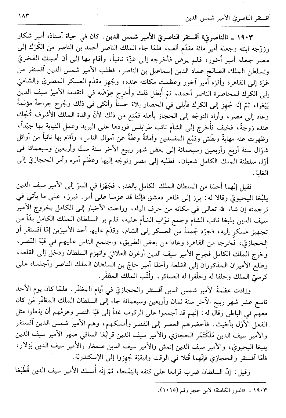 مؤلمةً وَعَاد إِلَى مصر وَأَرَادَ التَّوَجُّه إِلَى الْحجاز بأَهْله فَمنع من ذَلِك لِأَن وَالِدَة الْملك الْأَشْرَف كجك عِنْده زَوْجَة فخيف فَأخْرج إِلَى الشَّام نَائِب طرابلس فوردها على الْبَرِيد وعمال النِّيَابَة بهَا جيدا وَظَهَرت عَنهُ مهابة وبطش وقمع المفسدين وَأَمَانَة وعفة عَن أَمْوَال النَّاس وَأقَام بهَا نَائِبا من أَوَائِل شَوَّال سنة أَربع وَأَرْبَعين وَسَبْعمائة إِلَى بعض شهر ربيع الآخر سنة سِتّ وَأَرْبَعين وَسَبْعمائة فِي أول سلطنة الْملك الْكَامِل شعْبَان فَطَلَبه إِلَى مصر وَتوجه إِلَيْهَا وَعظم أمره وَأمر الْحِجَازِي إِلَى الْغَايَة فَقيل إنَّهُمَا أحسا من السُّلْطَان الْملك الْكَامِل بالغدر فجهزا فِي السِّرّ إِلَى الْأَمِير سيف الدّين يلبغا اليحيوي وَقَالا لَهُ برز إِلَى ظَاهر دمشق فإننا قد عزمنا على أَمر فبرز على مَا يَأْتِي فِي تَرْجَمته إِن شَاءَ الله تَعَالَى فِي مَكَانَهُ من حرف الْيَاء وراحت الْأَخْبَار إِلَى الْكَامِل بِخُرُوج الْأَمِير سيف الدّين يلبغا نَائِب الشَّام وَجمع نواب الشَّام عَلَيْهِ فَلم ير السُّلْطَان الْملك الْكَامِل بدا من تجهيز عَسْكَر إِلَيْهِ فَجرد جملَة من الْعَسْكَر إِلَى الشَّام وَقدم عَلَيْهَا أحد الأميرين إِمَّا آقسنقر أَو الْحِجَازِي فَخَرَجَا من الْقَاهِرَة وعادا من بعض الطَّرِيق وَاجْتمعَ النَّاس عَلَيْهِم فِي قبَّة النَّصْر وَخرج الْملك الْكَامِل فجرح الْأَمِير سيف الدّين أرغون العلائي وَانْهَزَمَ السُّلْطَان وَدخل إِلَى القلعة وطلع الأميران المذكورن إِلَى القلعة وأخذا أَمِير حَاج ابْن السُّلْطَان الْملك النَّاصِر وأجلساه على كرْسِي الْملك وحلفا لَهُ وحلفوا لَهُ العساكر ولقب الْملك المظفر وزادت عَظمَة الْأَمِير شمس الدّين آقسنقر والحجازي فِي أَيَّام المظفر فَلَمَّا كَانَ يَوْم الْأَحَد تَاسِع عشر شهر ربيع الآخر سنة ثَمَان وَأَرْبَعين وَسَبْعمائة جَاءَ إِلَى السُّلْطَان الْملك المظفر من كَانَ مَعَهم فِي الْبَاطِن وَقَالَ لَهُ إِنَّهُم قد أَجمعُوا على الرّكُوب غَدا إِلَى قبَّة النَّصْر وعزمهم أَن يَفْعَلُوا مثل الْفِعْل الأول بأخيك فأحضرهم الْعَصْر إِلَى الْقصر وأمسكهم وهم الْأَمِير شمس الدّين آقسنقر والأمير سيف الدّين ملكتمر الْحِجَازِي والأمير سيف الدّين قرابغا الساقي صهر الْأَمِير سيف الدّين يلبغا اليحيوي والأمير سيف الدّين إتمش والأميرسيف الدّين صمغار والأمير سيف الدّين بزلار فَأَما آقسنقر والحجازي فَإِنَّهُمَا قتلا فِي الْوَقْت والبقية جهزوا إِلَى الْإسْكَنْدَريَّة