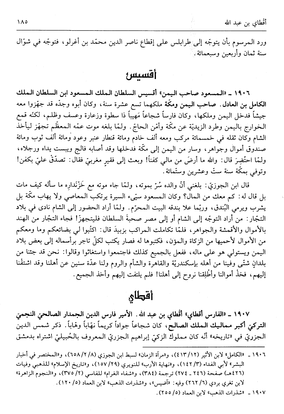 أقسيس السُّلْطَان الْملك المسعود ابْن السُّلْطَان الْملك الْكَامِل ابْن الْعَادِل صَاحب الْيمن وَمَكَّة ملكهمَا تسع عشرَة سنة وَكَانَ أَبوهُ وجده قد جهزوا مَعَه جَيْشًا فَدخل الْيمن وملكها وَكَانَ فَارِسًا شجاعاً مهيباً ذَا سطوة وزعارة وعسف وظلم لكنه قمع الْخَوَارِج بِالْيمن وطرد الزيدية عَن مَكَّة وَأمن الْحَاج وَلما بلغه موت عَمه الْمُعظم تجهز ليَأْخُذ الشَّام وَكَانَ ثقله فِي خَمْسمِائَة مركب وَمَعَهُ ألف خَادِم وَمِائَة قِنْطَار عنبر وعود وَمِائَة ألف ثوب وَمِائَة صندوق أَمْوَال وجواهر وَسَار من الْيمن إِلَى مَكَّة فَدَخلَهَا وَقد أَصَابَهُ فالج ويبست يَدَاهُ وَرجلَاهُ وَلما احْتضرَ قَالَ وَالله مَا أرْضى من مَالِي كفناً وَبعث إِلَى فقيرٍ مغربي فَقَالَ تصدق عَليّ بكفن وَتُوفِّي بِمَكَّة سنة سِتّ وَعشْرين وسِتمِائَة قَالَ ابْن الْجَوْزِيّ بَلغنِي أَن وَالِده سر بِمَوْتِهِ وَلما جَاءَ مَوته مَعَ خزنداره مَا سَأَلَهُ كَيفَ مَاتَ بل قَالَ لَهُ كم مَعَك من المَال وَكَانَ المسعود سيء السِّيرَة يرتكب الْمعاصِي وَلَا يهاب مَكَّة بل يشرب وَيَرْمِي البندق وَرُبمَا علا بندقه الْبَيْت الْمحرم