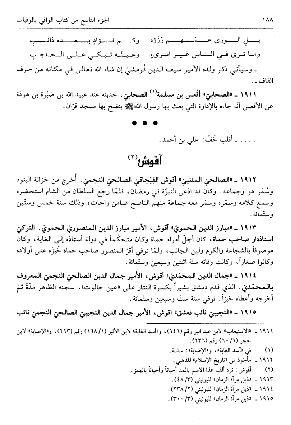 آقوش الْأَمِير جمال الدّين الصَّالِحِي النجمي الْمَعْرُوف بالمحمدي الَّذِي قدم دمشق بشيراً بكسرة التتار على عين جالوت سجنه الظَّاهِر مُدَّة ثمَّ أخرجه وَأَعْطَاهُ خبْزًا توفّي سنة سِتّ وَسبعين وسِتمِائَة