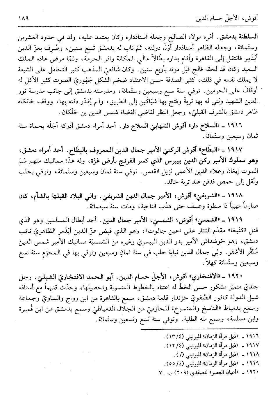 السلطنة بِدِمَشْق أمره مَوْلَاهُ الصَّالح وَجعله أستاذداره وَكَانَ يعْتَمد عَلَيْهِ ولد فِي حُدُود الْعشْرين وسِتمِائَة وَجعله الظَّاهِر أستاذدار أول دولته ثمَّ نَاب لَهُ بِدِمَشْق تسع سِنِين وَصرف بعز الدّين أيدمر فانتقل إِلَى الْقَاهِرَة وَأقَام بداره بطالاً عالي المكانة وافر الْحُرْمَة وَلما مرض عَاده الْملك السعيد وَكَانَ قد لحقه فالج قبل مَوته بِأَرْبَع سِنِين وَكَانَ شَافِعِيّ الْمَذْهَب كثير التحامل على الشِّيعَة لَا يملك نَفسه فِي ذَلِك كثير الصَّدَقَة حسن الِاعْتِقَاد ضخم الشكل جَهورِي الصَّوْت كثير الْأكل لَهُ أوقاف على الْحَرَمَيْنِ توفّي سنة سبع وَسبعين وسِتمِائَة ومدرسته بِدِمَشْق إِلَى جَانب مدرسة نور الدّين الشَّهِيد وَبنى لَهُ بهَا تربةً وَفتح بهَا شباكين إِلَى الطَّرِيق وَلم يقدر دَفنه بهَا ووقف خانكاه ظَاهر)