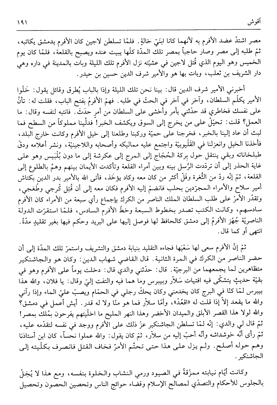 مصر اشْتَدَّ عضد الأفرم بِهِ لِأَنَّهُمَا كَانَا ابْني خالةٍ فَلَمَّا تسلطن لاجين كَانَ الأفرم بِدِمَشْق يكاتبه ثمَّ طلبه إِلَى مصر وَصَارَ حاجباً بِمصْر تِلْكَ الْمدَّة كلهَا يبيت عِنْده وَيُصْبِح بالقلعة فَلَمَّا كَانَ يَوْم الْخَمِيس وَهُوَ الْيَوْم الَّذِي قتل لاجين فِي عشيته نزل الأفرم تِلْكَ اللَّيْلَة وَبَات بِالْمَدِينَةِ فِي دَاره وَهِي دَار الشريف ابْن ثَعْلَب وَبَات بهَا هُوَ والأمير شرف الدّين حُسَيْن بن حيدر أَخْبرنِي الْأَمِير شرف الدّين قَالَ بَينا نَحن تِلْكَ اللَّيْلَة وَإِذا بِالْبَابِ يطْرق وَقَائِل يَقُول خلوا الْأَمِير يكلم السُّلْطَان وَآخر فِي آخر فِي الْحَث فِي طلبه فهم الأفرم بِفَتْح الْبَاب فَقلت لَهُ تأن على نَفسك فخاطري قد حَدثنِي بِأَمْر وأخشى على السُّلْطَان من أمرٍ حدث فانتبه لنَفسِهِ وَقَالَ مَا الْعَمَل قلت تحيل على من يخرج إِلَى السُّوق ويكشف الْخَبَر فدلينا مَمْلُوكا من السَّطْح فَمَا لبث أَن عَاد إِلَيْنَا بالْخبر فخرجنا على حمية وركبنا وطلعنا إِلَى خيل الأفرم وَكَانَت خَارج الْبَلَد فأخذنا الْخَيل وانعزلنا فِي القليوبية وَاجْتمعَ عَلَيْهِ مملوليكه وَأَصْحَابه واللاجينية وَنشر أَعْلَامه ودق طبلخاناته وَبَقِي ينْتَقل حول بركَة الْحجَّاج إِلَى المرج إِلَى عكرشة إِلَى مَا دون بلبيس وَهُوَ على غَايَة الحذر إِلَى أَن ترددت الرُّسُل بَينه وَبَين أُمَرَاء القلعة وتأكدت الْأَيْمَان بَينهم وهم بالطلوع إِلَى القلعة ثمَّ إِنَّه رد من الثغرة وفل أَكثر من كَانَ مَعَه وَكَاد يُؤْخَذ فَأتى الله بالأمير بدر الدّين بكتاش أَمِير سلَاح والأمراء المجردين بحلب فانضم إِلَيْهِ الأفرم فَكَانَ مَعَه إِلَى أَن قتل كرجي وطغجي وتقدر الْأَمر على طلب السُّلْطَان الْملك النَّاصِر من الكرك بِإِجْمَاع رَأْي سَبْعَة من الْأُمَرَاء كَانَ الأفرم سادسهم وَكَانَت الْكتب تصدر بخطوط السَّبْعَة وَخط الأفرم السَّادِس فَلَمَّا اسْتَقَرَّتْ الدولة الناصرية جهز الأفرم إِلَى دمشق كالحافظ لَهَا فوصل إِلَيْهَا على الْبَرِيد وَحكم فِيهَا بِغَيْر تقليدٍ مُدَّة انْتهى أَو كَمَا قَالَ