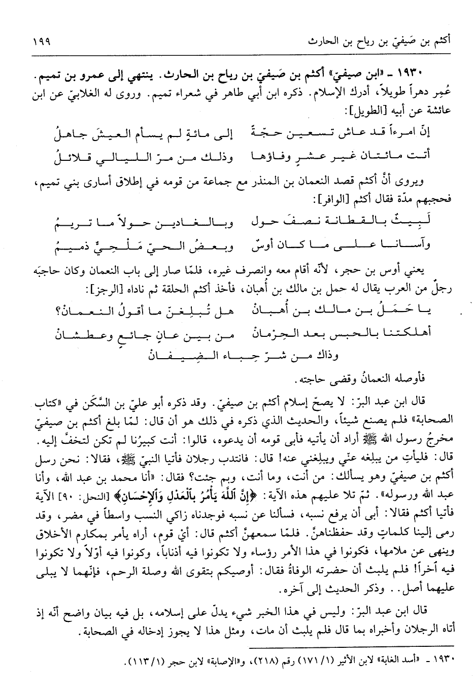 قَالَ ابْن عبد الْبر لَا يَصح إِسْلَام أَكْثَم بن صَيْفِي وَقد ذكره أَبُو عَليّ ابْن السكن فِي كتاب الصَّحَابَة فَلم يصنع شَيْئا والْحَدِيث الَّذِي ذكره فِي ذَلِك هُوَ أَن قَالَ لما بلغ أَكْثَم بن صَيْفِي مخرج رَسُول الله صلى الله عَلَيْهِ وَسلم أَرَادَ أَن يَأْتِيهِ فَأبى قومه أَن يَدعُوهُ قَالُوا أَنْت كَبِيرنَا لم تكن لتخف إِلَيْهِ قَالَ فليأت من يبلغهُ عني ويبلغني عَنهُ قَالَ فَانْتدبَ رجلَانِ فَأتيَا النَّبِي صلى الله عَلَيْهِ وَسلم فَقَالَا نَحن رسل أَكْثَم بن صَيْفِي وَهُوَ يَسْأَلك من أَنْت وَمَا أَنْت وَبِمَ جِئْت فَقَالَ أَنا مُحَمَّد بن عبد الله وَأَنا عبد الله وَرَسُوله ثمَّ تَلا عَلَيْهِم هَذِه الْآيَة إنّ اللهَ يأمُرُ بالعَدْلِ والإحْسانِ الْآيَة فَأتيَا أَكْثَم فَقَالَا أَبى أَن يرفع نسبه فسألنا عَن نسبه فوجدناه زاكي النّسَب واسطاً فِي مُضر وَقد رمى إِلَيْنَا كَلِمَات وَقد حفظناهن فَلَمَّا سمععهن أَكْثَم قَالَ أَي قوم أرَاهُ يَأْمر بمكارم الْأَخْلَاق وَينْهى عَن ملامها فكونوا فِي هَذَا الْأَمر رُؤَسَاء وَلَا تَكُونُوا فِيهِ أذناباً وَكُونُوا فِيهِ أَولا وَلَا تَكُونُوا فِيهِ آخرا فَلم يلبث أَن حَضرته الْوَفَاة فَقَالَ أوصيكم بتقوى الله وصلَة الرَّحِم فَإِنَّهُمَا لَا يبْلى عَلَيْهِمَا أصل وَذكر الحَدِيث إِلَى آخِره قَالَ ابْن عبد الْبر وَلَيْسَ فِي هَذَا الْخَبَر شَيْء يدل على إِسْلَامه بل فِيهِ بَيَان وَاضح أَنه إِذْ أَتَاهُ الرّجلَانِ وأخبراه بِمَا قَالَ فَلم يلبث أَن مَاتَ وَمثل هَذَا لَا يجوز إِدْخَاله فِي الصَّحَابَة)