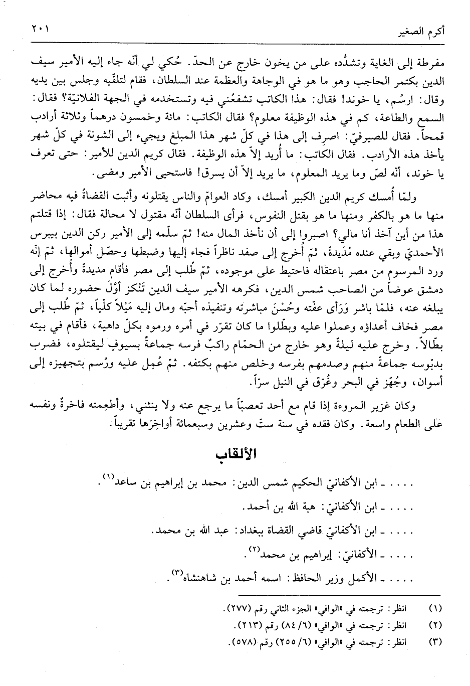 وَلما أمسك كريم الدّين الْكَبِير أمسك وَكَاد الْعَوام وَالنَّاس يقتلونه وَأثبت الْقُضَاة فِيهِ محَاضِر مِنْهَا مَا هُوَ بالْكفْر وَمِنْهَا مَا هُوَ بقتل النُّفُوس فَرَأى السُّلْطَان أَنه مقتول لَا محَالة فَقَالَ إِذا قتلتم هَذَا من أَيْن آخذ أَنا مَالِي اصْبِرُوا إِلَى أَن نَأْخُذ المَال مِنْهُ ثمَّ سلمه إِلَى الْأَمِير ركن الدّين بيبرس الأحمدي وَبَقِي عِنْده مديدة ثمَّ أخرج إِلَى صفد نَاظرا فجَاء إِلَيْهَا وضبطها وَحصل أموالها ثمَّ إِنَّه ورد المرسوم من مصر باعتقاله فاحتيط على موجوده ثمَّ طلب إِلَى مصر فَأَقَامَ مديدةً وَأخرج إِلَى دمشق عوضاُ من الصاحب شمس الدّين فكرهه الْأَمِير سيف الدّين تنكز أول حُضُوره لما كَانَ يبلغهُ عَنهُ فَلَمَّا بَاشر وَرَأى عفته وَحسن مُبَاشَرَته وتنفيذه أحبه وَمَال إِلَيْهِ وَمَال إِلَيْهِ ميلًا كلياً ثمَّ طلب إِلَى مصر فخاف أعداؤه وَعمِلُوا عَلَيْهِ وبطلوا مَا كَانَ تقرر فِي أمره ورموه بِكُل داهية فَأَقَامَ فِي بَيته بطالاً وَخرج عَلَيْهِ لَيْلَة وَهُوَ خَارج من الْحمام رَاكب فرسه جماعةٌ بسيوف ليقتلوه فَضرب بدبوسه جماعةُ مِنْهُم وصدمهم بفرسه وخلص مِنْهُم بكتفه ثمَّ عمل عَلَيْهِ ورسم بتجهيزه إِلَى أسوان وجهز فِي الْبَحْر وغرق فِي النّيل سرا