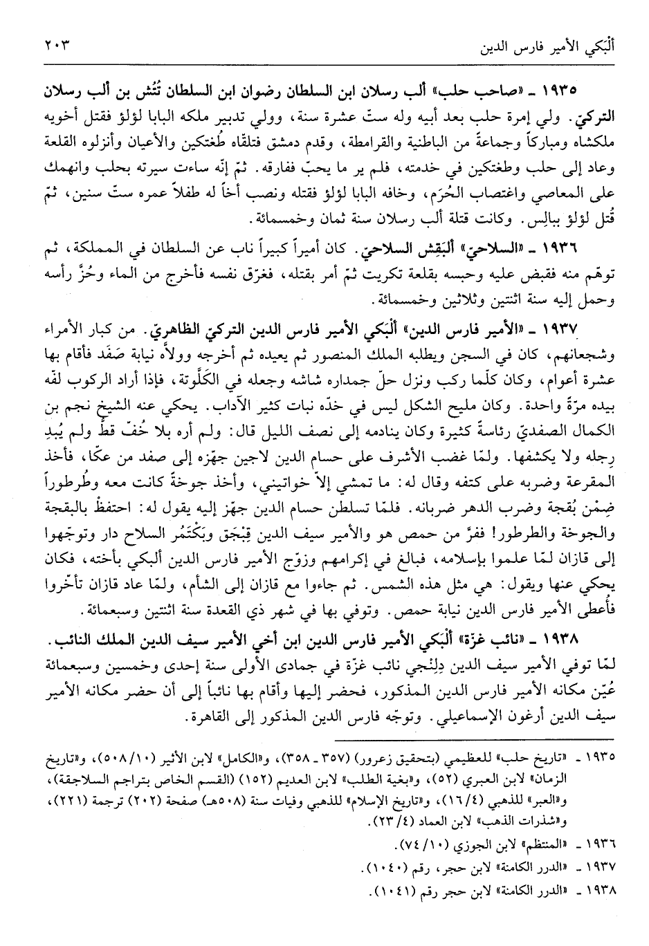 ألبكي الْأَمِير فَارس الدّين التركي الظَّاهِرِيّ من كبار الْأُمَرَاء وشجعانهم كَانَ فِي السجْن ويطلبه الْملك الْمَنْصُور ثمَّ يُعِيدهُ ثمَّ أخرجه وولاه نِيَابَة صفد فَأَقَامَ بهَا عشرَة أَعْوَام وَكَانَ كلما ركب وَنزل حل جمداره شاشه وَجعله فِي الكلوتة فَإِذا أَرَادَ الرّكُوب لفه بِيَدِهِ مرّة وَاحِدَة