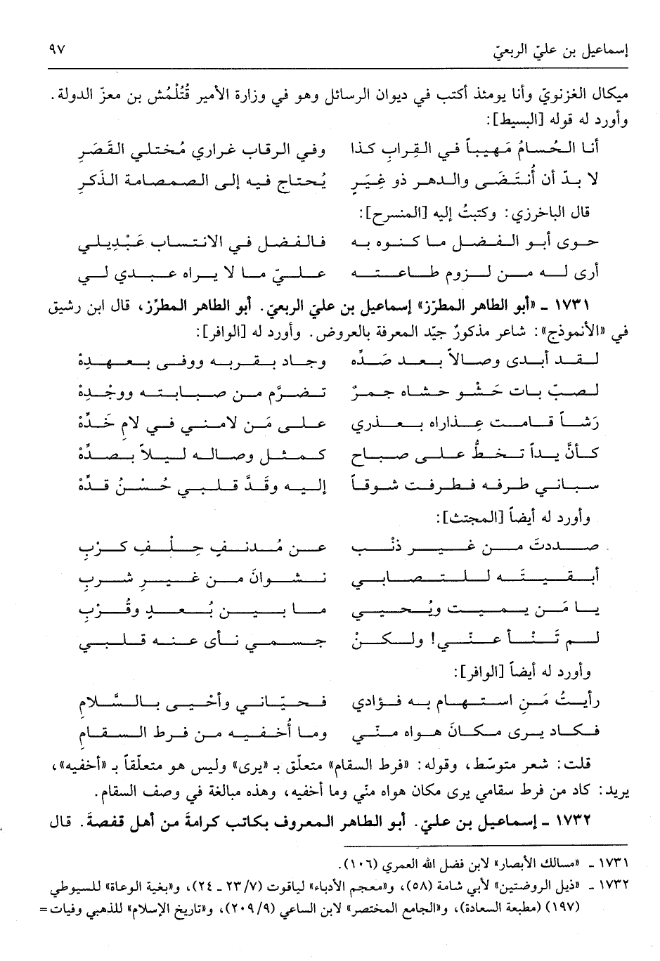 إِسْمَاعِيل بن عَليّ الربعِي أَبُو الطَّاهِر الْمُطَرز قَالَ ابْن رَشِيق فِي الأنموذج شَاعِر مَذْكُور جيد الْمعرفَة بالعروض وَأورد لَهُ من الوافر
