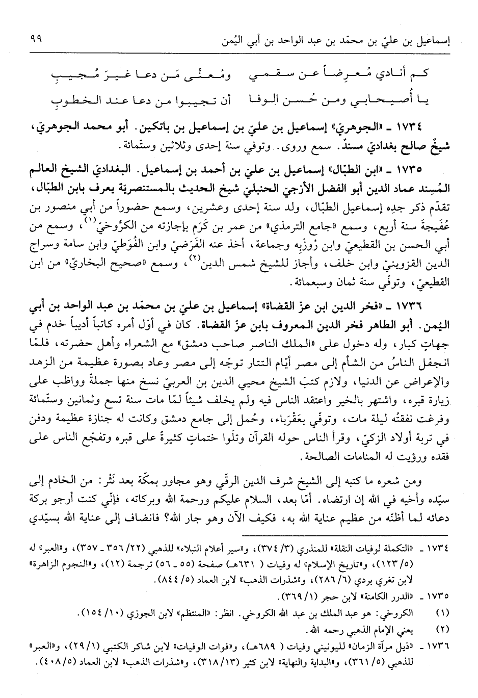 وَمن شعره مَا كتبه إِلَى الشَّيْخ شرف الدّين الرقي وَهُوَ مجاور بِمَكَّة بعد نشر من الْخَادِم إِلَى سَيّده أَخِيه فِي الله إِن ارْتَضَاهُ أما بعد السَّلَام عَلَيْكُم وَرَحْمَة الله وَبَرَكَاته فَإِنِّي كنت أَرْجُو بركَة دُعَائِهِ لما أَظُنهُ من عَظِيم عناية الله بِهِ فَكيف الْآن وَهُوَ جَار الله فانضاف إِلَى عناية الله بسيدي