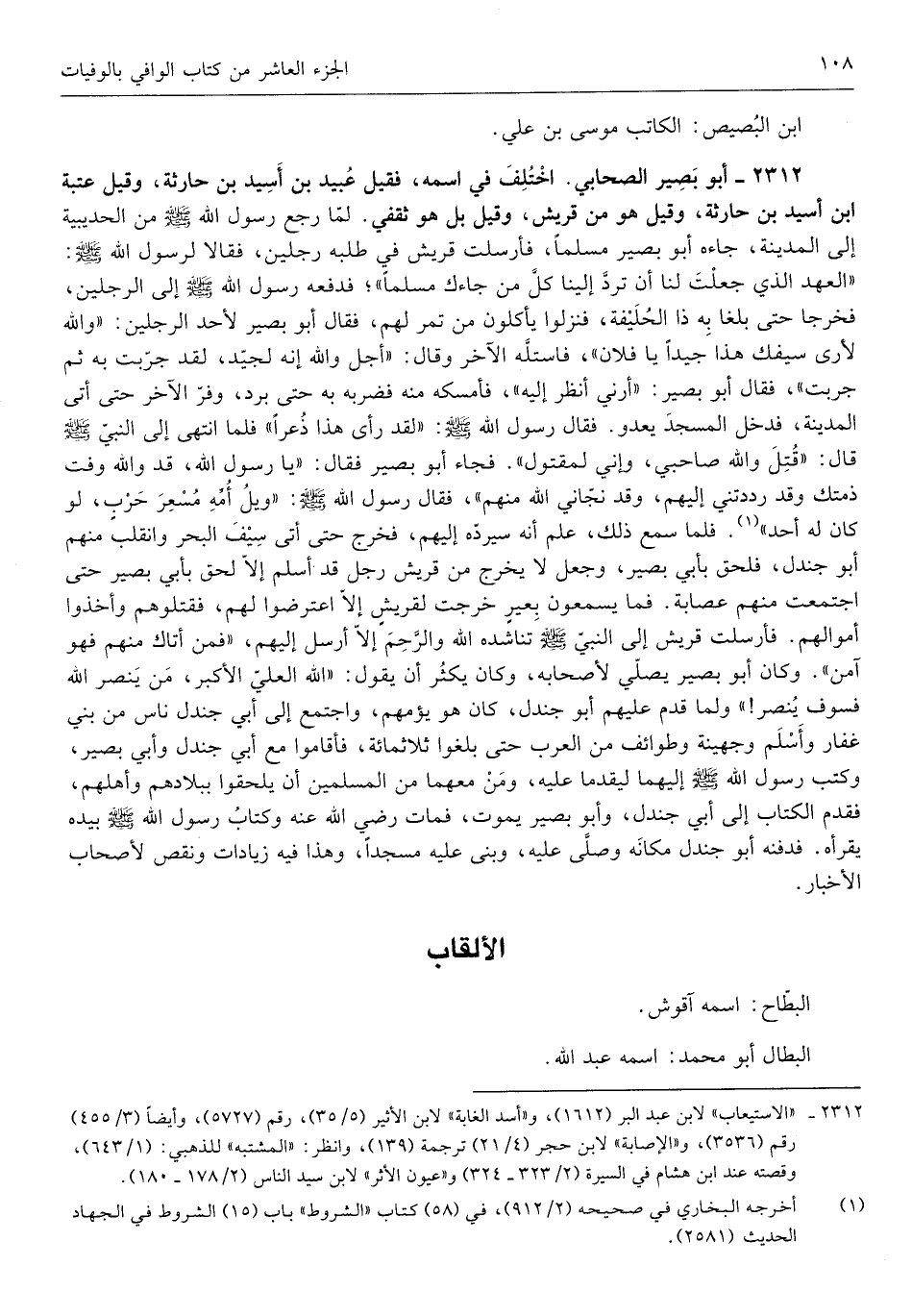 اخْتلف فِي اسْمه فَقيل عبيد بن أسيد بن حَارِثَة وَقيل عتبَة بن أسيد بن حَارِثَة وَقيل عتبَة بن أسيد بن حَارِثَة وَقيل هُوَ من قُرَيْش وَقيل بل هُوَ ثقفي لما رَجَعَ رَسُول الله صلى الله عَلَيْهِ وَسلم من الْحُدَيْبِيَة إِلَى الْمَدِينَة جَاءَهُ أَبُو بَصِير مُسلما فَأرْسلت قُرَيْش فِي طلبه رجلَيْنِ فَقَالَا لرَسُول الله صلى الله عَلَيْهِ وَسلم الْعَهْد الَّذِي جعلت لنا أَن ترد إِلَيْنَا كل من جَاءَك مُسلما فَدفعهُ رَسُول الله صلى الله عَلَيْهِ وَسلم إِلَى الرجلَيْن فَخَرَجَا حَتَّى بلغا بِهِ ذَا الحليفة فنزلوا يَأْكُلُون من تمر لَهُم فَقَالَ أَبُو بَصِير لأحد الرجلَيْن وَالله لأرى سَيْفك هَذَا جيدا يَا فلَان فاستله الآخر وَقَالَ أجل وَالله إِنَّه لجيد لقد جربت بِهِ ثمَّ جربت فَقَالَ أَبُو بَصِير أَرِنِي أنظر إِلَيْهِ فأمسكه مِنْهُ فَضَربهُ حَتَّى برد وفر الآخر حَتَّى أَتَى الْمَدِينَة فَدخل الْمَسْجِد يعدو فَقَالَ رَسُول الله صلى الله عَلَيْهِ وَسلم لقد رأى هَذَا ذعراً فَلَمَّا انْتهى إِلى النَّبِي صلى الله عَلَيْهِ وَسلم قَالَ قتل وَالله صَاحِبي وَإِنِّي لمقتول فجَاء أَبُو بَصِير فَقَالَ يَا رَسُول الله قد وَالله وفت ذِمَّتك وَقد رددتني إِلَيْهِم وَقد نجاني الله مِنْهُم فَقَالَ رَسُول الله صلى الله عَلَيْهِ وَسلم ويل أمه مسعر حَرْب لَو كَانَ لَهُ أحد فَلَمَّا سمع ذَلِك علم أَنه سيرده إِلَيْهِم فَخرج حَتَّى أَتَى سيف الْبَحْر وانقلب مِنْهُم أَبُو جندل فلحق بِأبي بَصِير وَجعل لَا يخرج من قُرَيْش رجل قد أسلم إِلَّا لحق بِأبي بَصِير حَتَّى اجْتمعت مِنْهُم عِصَابَة فَمَا يسمعُونَ بعير خرجت لقريش إِلَّا اعْترضُوا لَهُم فَقَتَلُوهُمْ وَأخذُوا أَمْوَالهم فَأرْسلت قُرَيْش إِلَى النَّبِي صلى الله عَلَيْهِ وَسلم تناشده الله وَالرحم إِلَّا أرسل إِلَيْهِم فَمن أَتَاك مِنْهُم فَهُوَ آمن وَكَانَ أَبُو بَصِير يُصَلِّي لأَصْحَابه وَكَانَ يكثر أَن يَقُول الله الْعلي الْأَكْبَر من ينصر الله فَسَوف ينصر وَلما قدم عَلَيْهِم أَبُو جندل كَانَ هُوَ يؤمهم وَاجْتمعَ إِلَى أبي جندل نَاس من بني غفار وَأسلم وجهينة وَطَوَائِف من الْعَرَب حَتَّى بلغُوا ثَلَاث مائَة فأقاموا مَعَ أبي جندل وَأبي بَصِير وَكتب رَسُول الله صلى الله عَلَيْهِ وَسلم إِلَيْهِمَا ليقدما عَلَيْهِ وَمن مَعَهُمَا من الْمُسلمين أَن يلْحقُوا ببلادهم وأهلهم فَقدم الْكتاب إِلَى أبي جندل وَأَبُو بَصِير يَمُوت فَمَاتَ رَضِي الله عَنهُ وَكتاب رَسُول الله صلى الله عَلَيْهِ وَسلم بِيَدِهِ يقرأه فدفنه أَبُو جندل مَكَانَهُ وَصلى عَلَيْهِ وَبنى عَلَيْهِ مَسْجِدا وَهَذَا فِيهِ زيادات وَنقص لأَصْحَاب الْأَخْبَار