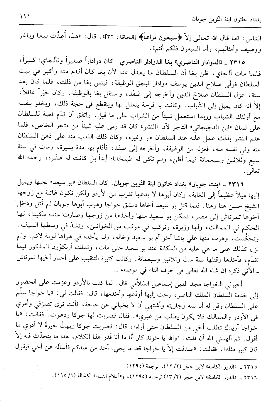 بَغْدَاد خاتون ابْنة النوين جوبان كَانَ السُّلْطَان بو سعيد يُحِبهَا ويميل إِلَيْهَا ميلًا عَظِيما إِلَى الْغَايَة وَكَانَ أَبوهَا لَا يَدعهَا تقرب من الأردو وَلَكِن تكون غَائِبَة مَعَ زَوجهَا الشَّيْخ حسن هُنَا وَهنا فَلَمَّا قتل بو سعيد أخاها دمشق خواجا وهر بأبوها جوبان ثمَّ قتل وَدخل أَخُوهَا تمرتاش إِلَى مصر تمكن بو سعيد مِنْهَا وَأَخذهَا من زَوجهَا وَصَارَت عِنْده مكينة لَهَا الحكم فِي الممالك وَلها وزيرة وتركب فِي موكب من الخواتين وتشد فِي وَسطهَا السَّيْف وتحكمت وهرب مِنْهَا عَليّ باشا أَخُو أم بو سعيد وخاله وَلم يَأْخُذهُ فِي هَواهَا لومة لائم وَلم تزل كَذَلِك على مَا هِيَ عَلَيْهِ من المكانة عِنْد بو سعيد حَتَّى مَاتَ وتملك أربكوون الْمَذْكُور فِيمَا تقدم فَأَخذهَا وقتلها سنة سِتّ وَثَلَاثِينَ وَسبع مائَة وَكَانَت كَثِيرَة التنقيب على أَخْبَار أَخِيهَا تمرتاش الْآتِي ذكره إِن شَاءَ الله تَعَالَى فِي حرف التَّاء فِي مَوْضِعه أَخْبرنِي الخواجا مجد الدّين إِسْمَاعِيل السلَامِي قَالَ لما كنت بالأردو وعزمت على الْحُضُور إِلَى خدمَة السُّلْطَان الْملك النَّاصِر رحت إِلَيْهَا أودعها وأخدمها قَالَ فَقَالَت لي يَا خواجا سلم على السُّلْطَان وَقل لَهُ أَنا بنته وجاريته وأشتهي أَن لَا يخباني عَن حَاجَة فَأَنت ترى تصرفي وأمري فِي الأردو والممالك فَلَا يكون يطْلب من غَيْرِي فَقَالَ فَضربت لَهَا جوكا ودعوت فَقَالَت يَا خواجا أريدك تطلب أخي من السُّلْطَان حَتَّى آراه قَالَ فَضربت جوكا وبهت حيرةً لَا أَدْرِي مَا أَقُول