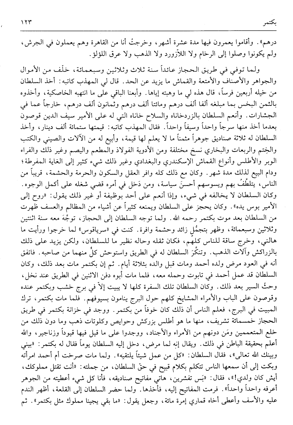 والأصناف والأمتعة والقماش مَا يزِيد عَن الْحَد قَالَ لي الْمُهَذّب كَاتبه أَخذ السُّلْطَان من خيله أَرْبَعِينَ فرسا قَالَ لي هَذِه لي مَا وهبته إِيَّاهَا وأبعنا الْبَاقِي على مَا انتهبه الخاصكية وأخذوه بِالثّمن البخس بِمَا مبلغه ألفا ألف دِرْهَم وَمِائَتَا ألف دِرْهَم وَثَمَانُونَ ألف دِرْهَم خَارِجا عَمَّا فِي الجشارات وأنعم السُّلْطَان بالزردخاناه وَالسِّلَاح خاناه الَّتِي لَهُ على الْأَمِير سيف الدّين قوصون بَعْدَمَا أَخذ مِنْهَا سرجاً وَاحِدًا وسيفاً وَاحِدًا فَقَالَ الْمُهَذّب كَاتبه قيمتهَا سِتّمائَة ألف دِينَار وَأخذ السُّلْطَان لَهُ ثَلَاثَة صناديق جوهراً مثمناً مَا لَا يعلم لَهَا قيمَة وأبيع لَهُ من الْآلَات والصيني والكتب والختم والربعات وَالْبُخَارِيّ نسخ مُخْتَلفَة وَمن الْأَدْوِيَة الفولاذ والمطعم واليصم وَغير ذَلِك وَالْفراء الْوَبر والأطلس وأنواع القماش الاسكندري والبغدادي وَغير ذَلِك شَيْء كثير إِلَى الْغَايَة المفرطة ودام البيع لذَلِك مُدَّة شهر وَكَانَ مَعَ ذَلِك كُله وافر الْعقل والسكون وَالْحُرْمَة والحشمة قَرِيبا من النَّاس يتلطف بهم ويسوسهم أحسن سياسة وَمن دخل فِي أمره قضي شغله على أكمل الْوُجُوه وَكَانَ السُّلْطَان لَا يُخَالِفهُ فِي شَيْء وَإِذا أنعم على أحد بوظيفة أَو غير ذَلِك يَقُول روح إِلَى الْأَمِير بوس يَده وَكَانَ يحجز على السُّلْطَان ويمنعه كثيرا عَن أَشْيَاء من الْمَظَالِم والعسف ظَهرت من السُّلْطَان بعد موت بكتمر رَحمَه الله تَعَالَى وَلما توجه السُّلْطَان إِلَى الْحجاز توجه مَعَه سنة اثْنَتَيْنِ وَثَلَاثِينَ وَسبع مائَة وَظهر بتجمل زَائِد وحشمة وافرة كنت فِي سرياقوس لما خَرجُوا وَرَأَيْت مَا هالني وَخرج ساقة للنَّاس كلهم فَكَانَ ثقله وحاله نَظِير مَا للسُّلْطَان وَلَكِن يزِيد على ذَلِك بالزراكش وآلات الذَّهَب وتنكر السُّلْطَان لَهُ فِي الطَّرِيق واستوحش كل مِنْهُمَا من صَاحبه فاتفق أَنه فِي الْعود مرض وَلَده أَحْمد وَمَات قبل وَالِده بِثَلَاثَة أَيَّام ثمَّ إِن بكتمر مَاتَ بعد ذَلِك وَكَانَ السُّلْطَان قد عمل أَحْمد فِي تَابُوت وَحمله مَعَه فَلَمَّا مَاتَ أَبوهُ دفن الِاثْنَيْنِ فِي الطَّرِيق عِنْد نخل وحث السّير بعد ذَلِك وَكَانَ السُّلْطَان تِلْكَ السفرة كلهَا لَا يبيت إِلَّا فِي برج خشب وبكتمر عِنْده وقوصون على الْبَاب والأمراء الْمَشَايِخ كلهم حول البرج ينامون بسيوفهم فَلَمَّا مَاتَ بكتمر ترك الْمبيت فِي البرج فَعلم النَّاس أَن ذَلِك كَانَ خوفًا من بكتمر وَوجد فِي خزانَة بكتمر فِي طَرِيق الْحجاز خمس مائَة تشريف مِنْهَا مَا هُوَ أطلس بزركش وحوايص وكلوتات ذهب وَمَا دون ذَلِك من خلع المتعممين وَمن دونهم من الْأُمَرَاء والأجناد ووجدوا على مَا قيل فِيهَا قيوداً وزناجير وَالله أعلم بِحَقِيقَة الْبَاطِن فِي ذَلِك وَيُقَال إِنَّه لما مرض دخل إِلَيْهِ السُّلْطَان يَوْمًا فَقَالَ لَهُ بكتمر بيني)