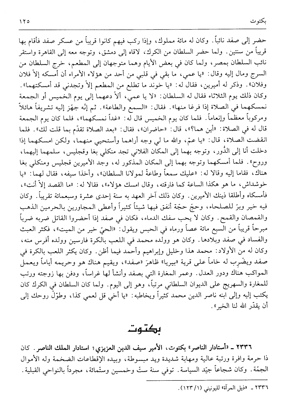 بكتوت الْأَمِير سيف الدّين العزيزي استادار الْملك النَّاصِر كَانَ ذَا حُرْمَة وافرة ورتبة عالية ومهابة شَدِيدَة وَيَد مبسوطة وَبِيَدِهِ الإقطاعات الضخمة وَله الْأَمْوَال الجمة وَكَانَ شجاعاً جيد السياسة توفّي سنة سِتّ وَخمسين وست مائَة مُجَردا بالنواحي الْقبلية
