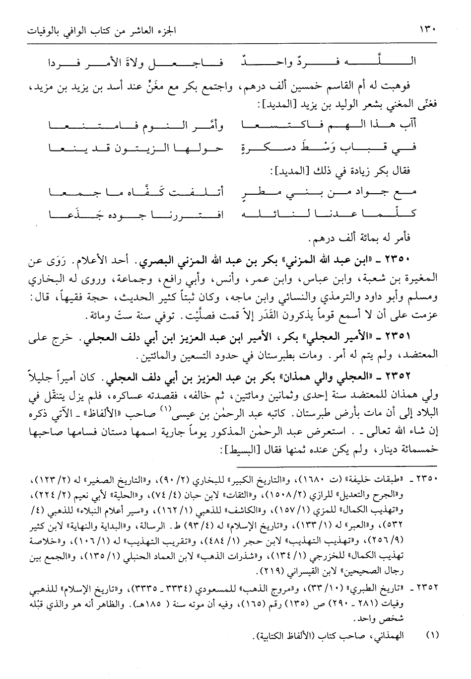 بكر بن عبد الله الْمُزنِيّ الْبَصْرِيّ أحد الْأَعْلَام روى عَن الْمُغيرَة بن شُعْبَة وَابْن عَبَّاس وَابْن عمر وَأنس وَأبي رَافع وَجَمَاعَة وروى لَهُ البُخَارِيّ وَمُسلم وَأَبُو دَاوُد وَالتِّرْمِذِيّ وَالنَّسَائِيّ وَابْن مَاجَه وَكَانَ ثبتاً كثير الحَدِيث حجَّة فَقِيها قَالَ عزمت على أَن لَا أسمع قوما يذكرُونَ الْقدر إِلَّا قُمْت فَصليت توفّي سنة سِتّ وَمِائَة