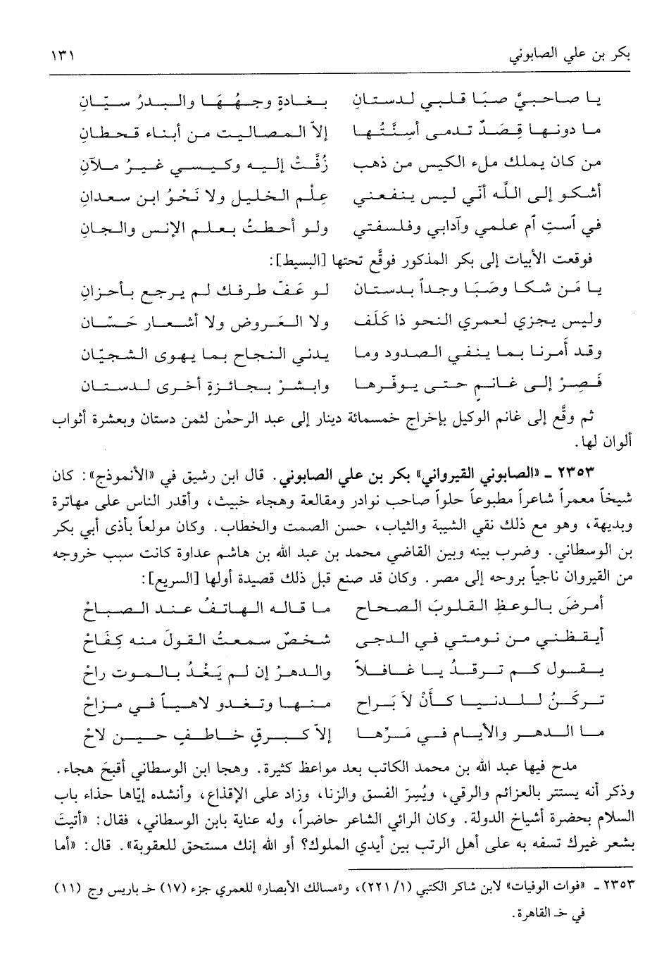 بكر بن عَليّ الصَّابُونِي قَالَ ابْن رَشِيق فِي الأنموذج كَانَ شَيخا معمراً شَاعِرًا مطبوعاً حلواً نَوَادِر ومقالعة وهجاء خَبِيث وأقدر النَّاس على مهاترة وبديهة وَهُوَ مَعَ ذَلِك نفي الشيبة وَالثيَاب حسن الصمت وَكَانَ مُولَعا بأذى أبي بكر ابْن الوسطاني وَضرب بَينه وَبَين القَاضِي محمّد بن عبد الله بن هَاشم عَدَاوَة كَانَت سَبَب خُرُوجه من القيروان ناجياً بِرُوحِهِ إِلَى مصر
