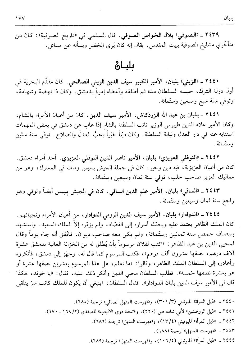 بلبان الْأَمِير الْكَبِير سيف الدّين الزيني الصَّالِحِي كَانَ مقدم البحرية فِي أول دولة التّرْك حَبسه السُّلْطَان مُدَّة ثمَّ أطلقهُ وَأَعْطَاهُ إمرةً بِدِمَشْق وَكَانَ ذَا نهضة وشهامة وَتُوفِّي سنة سبع وَسبعين وست مائَة