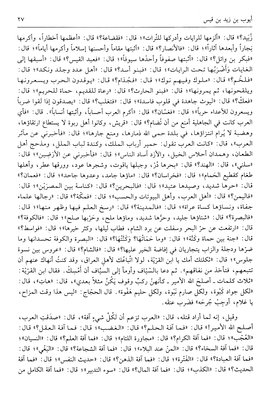 زبيد قَالَ ألزمها للرايات وأدركها للترات قَالَ فقضاعة قَالَ أعظمها أخطاراً وَأَكْرمهَا نجاراً وأبعدها آثاراً قَالَ فالأنصار قَالَ أثبتها مقَاما وأحسنها إسلاماً وَأَكْرمهَا أَيَّامًا قَالَ فبكر بن وَائِل قَالَ أثبتها صُفُوفا وأحدها سيوفاً قَالَ فعبد الْقَيْس قَالَ أسبقها إِلَى الغايات وأضربها تَحت الرَّايَات قَالَ فبنو أَسد قَالَ أهل عدد وَجلد ونكد قَالَ فلخم قَالَ مُلُوك وَفِيهِمْ نوك قَالَ فجذام قَالَ يوقدون الْحَرْب ويسعرونها ويلقحونها ثمَّ يمرونها قَالَ فبنو الْحَارِث قَالَ رُعَاة للقديم حماة للحريم قَالَ فعك قَالَ لُيُوث جاهدة فِي قُلُوب فَاسِدَة قَالَ فتغلب قَالَ يصدقون إِذا لقوا ضربا ويسعرون للأعداء حَربًا قَالَ فغسان قَالَ أكْرم الْعَرَب أحساباً وأثبتهم أنساباً قَالَ فَأَي الْعَرَب كَانَت فِي الْجَاهِلِيَّة أَمنه من أَن تضام قَالَ قُرَيْش وَكَانُوا أهل ربوة لَا يُسْتَطَاع ارتقاؤها وهضبة لَا يرام انتزاؤها فِي بَلْدَة حمى الله ذمارها وَمنع جارها قَالَ فَأَخْبرنِي عَن مآثر الْعَرَب قَالَ كَانَت الْعَرَب تَقول حمير أَرْبَاب الْملك وَكِنْدَة لباب الْملَل ومذحج أهل الطعان وهمدان أحلاس الْخَيل والأزد آساد النَّاس قَالَ فَأَخْبرنِي عَن الْأَرْضين قَالَ سلني قَالَ الْهِنْد قَالَ)