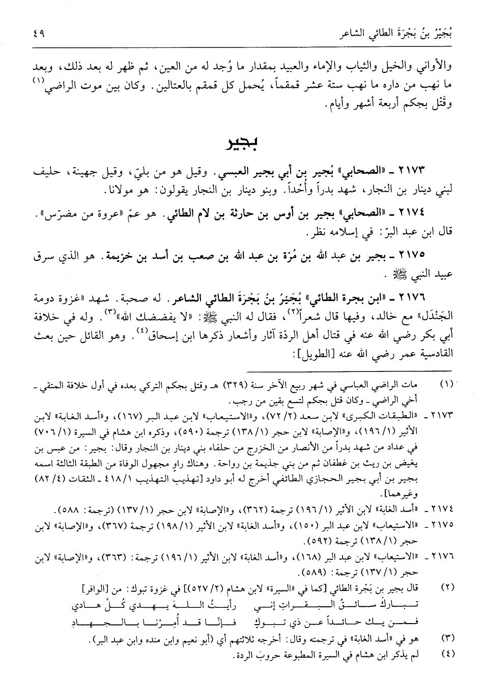 بجير بن بجرة الطَّائِي الشَّاعِر لَهُ صُحْبَة شهد غَزْوَة دومة الجندل مَعَ خَالِد وفيهَا قَالَ شعرًا فَقَالَ لَهُ النَّبِي صلى الله عَلَيْهِ وَسلم لَا يفضضك الله وَله فِي خلَافَة أبي بكر رَضِي الله عَنهُ فِي قتال أهل الرِّدَّة آثَار وأشعار ذكرهَا ابْن إِسْحَق وَهُوَ الْقَائِل حِين بعث الْقَادِسِيَّة عمر رَضِي الله عَنهُ