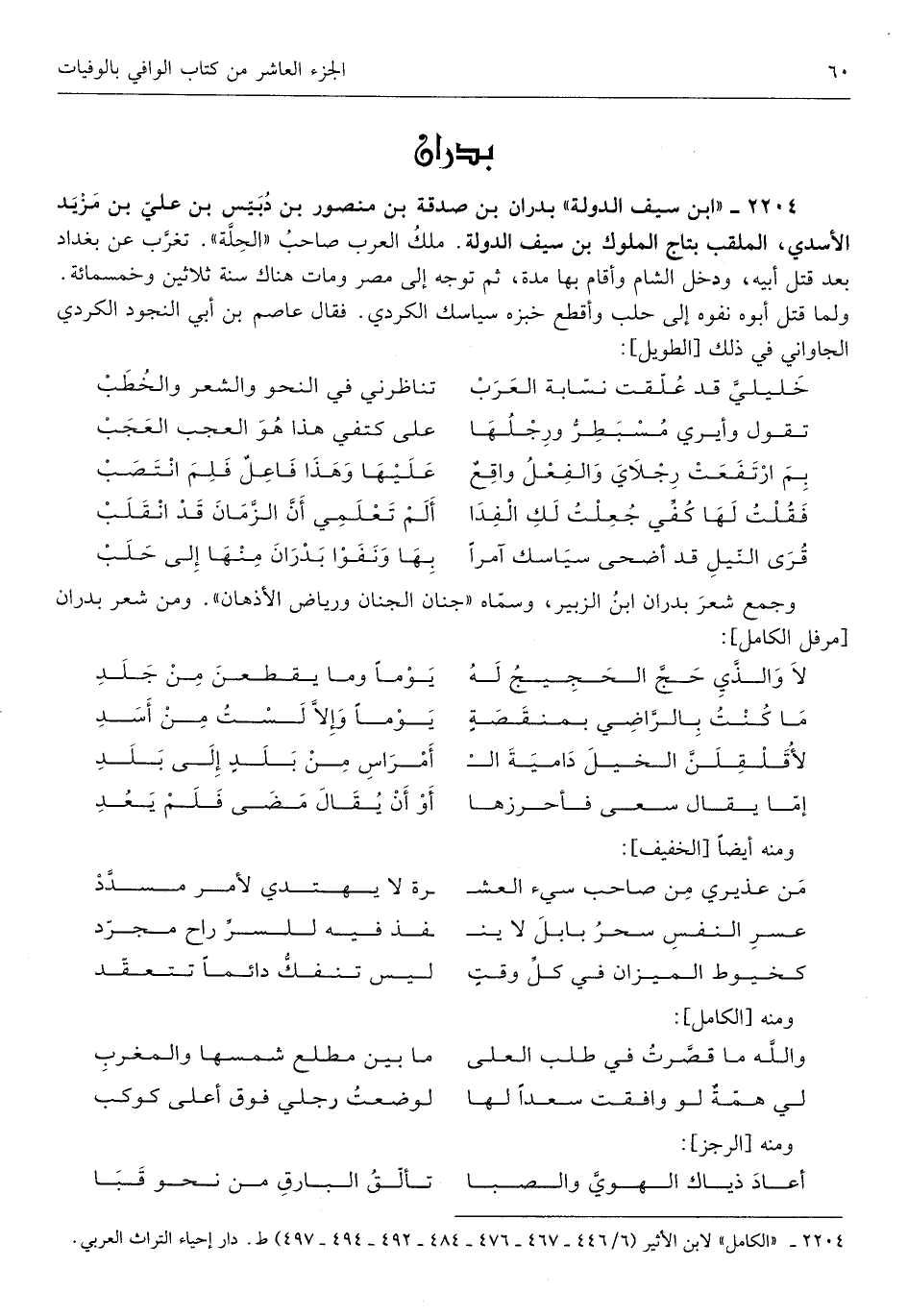 بدران بن صَدَقَة بن مَنْصُور بن دبيس بن عَليّ بن مزِيد الْأَسدي الملقب تَاج الْمُلُوك بن سيف الدولة ملك الْعَرَب صَاحب الْحلَّة تغرب عَن بَغْدَاد بعد قتل أَبِيه وَدخل الشَّام وَأقَام بهَا مُدَّة ثمَّ توجه إِلَى مصر وَمَات هُنَاكَ سنة ثَلَاثِينَ وَخمْس مائَة وَلما قتل أَبوهُ نفوه إِلَى حلب وأقطع خبزه سياسك الْكرْدِي فَقَالَ عَاصِم بن أبي النجُود الْكرْدِي الجاواني فِي ذَلِك