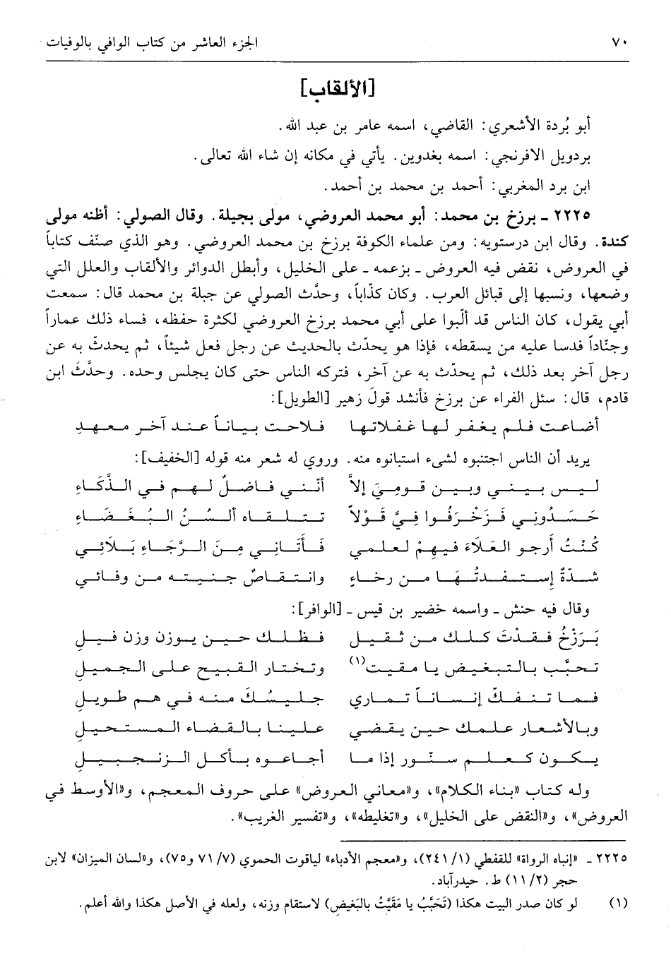 وَقَالَ الصولي أَظُنهُ مولى كِنْدَة وَقَالَ ابْن درسْتوَيْه وَمن عُلَمَاء الْكُوفَة برزخ بن مُحَمَّد الْعَرُوضِي وَهُوَ الَّذِي صنف كتابا فِي الْعرُوض نقض فِيهِ الْعرُوض بِزَعْمِهِ على الْخَلِيل وأبطل الدَّوَائِر والألقاب والعلل الَّتِي وَضعهَا ونسبها إِلَى قبائل الْعَرَب وَكَانَ كذابا وَحدث الصولي عَن جبلة بن مُحَمَّد قَالَ سَمِعت أبي يَقُول كَانَ النَّاس قد ألبوا على أبي مُحَمَّد برزخ الْعَرُوضِي لِكَثْرَة حفظه فسَاء ذَلِك عماراً وجنادا فدسا عَلَيْهِ من يسْقطهُ فَإِذا هُوَ يحدث بِالْحَدِيثِ عَن رجل فعل شَيْئا ثمَّ يحدث بِهِ عَن رجل آخر بعد ذَلِك ثمَّ يحدث بِهِ عَن آخر فَتَركه النَّاس حَتَّى كَانَ يجلس وَحده وَحدث ابْن قادم قَالَ سُئِلَ الْفراء عَن برزخ فَأَنْشد قَول زُهَيْر
