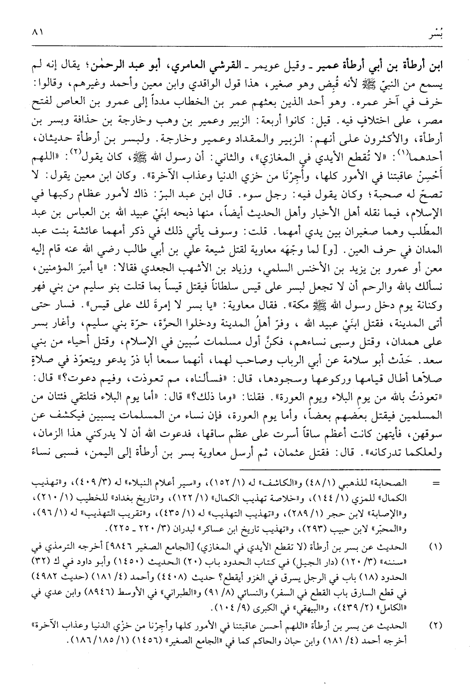 وَقيل عُوَيْمِر الْقرشِي العامري أَبُو عبد الرَّحْمَن يُقَال إِنَّه لم يسمع من النَّبِي صلى الله عَلَيْهِ وَسلم لِأَنَّهُ قبض وَهُوَ صَغِير هَذَا قَول الْوَاقِدِيّ وَابْن معِين وَأحمد وَغَيرهم وَقَالُوا خرف فِي آخر عمره وَهُوَ أحد الَّذين بَعثهمْ عمر بن الْخطاب مدَدا إِلَى عَمْرو بن الْعَاصِ لفتح مصر على اخْتِلَاف فِيهِ قيل كَانُوا أَرْبَعَة الزبير وَعُمَيْر بن وهب وخارجة بن حذافة وَبسر بن أَرْطَأَة وَالْأَكْثَرُونَ على أَنهم الزبير والمقداد وَعُمَيْر وخارجة ولبسر بن أَرْطَأَة حديثان أَحدهمَا لَا تقطع الْأَيْدِي فِي الْمَغَازِي وَالثَّانِي أَن رَسُول الله صلى الله عَلَيْهِ وَسلم كَانَ يَقُول اللَّهُمَّ أحسن عاقبتنا فِي الْأُمُور كلهَا وأجرنا من خزي الدُّنْيَا وَعَذَاب الْآخِرَة وَكَانَ ابْن معِين يَقُول لَا تصح لَهُ صُحْبَة وَكَانَ يَقُول فِيهِ رجل سوء قَالَ ابْن عبد الْبر ذَاك لأمور عِظَام ركبهَا فِي الْإِسْلَام فِيمَا نَقله أهل الْأَخْبَار وَأهل الحَدِيث أَيْضا مِنْهَا ذبحه ابْني عبيد الله بن الْعَبَّاس بن عبد الْمطلب وهما صغيران بَين يَدي أمهما قلت وسوف يَأْتِي ذَلِك فِي ذكر أمهما عَائِشَة بنت عبد المدان فِي حرف الْعين وَلما وَجهه مُعَاوِيَة لقتل شيعَة عَليّ بن أبي طَالب قَامَ إِلَيْهِ معن أَو عَمْرو بن يزِيد بن الْأَخْنَس السّلمِيّ وَزِيَاد بن الْأَشْهب الْجَعْدِي فَقَالَا يَا أَمِير الْمُؤمنِينَ نَسْأَلك بِاللَّه وَالرحم أَن لَا تجْعَل لبسر على قيس سُلْطَانا فَيقْتل قيسا بِمَا قتلت بَنو سليم من بني فهر وكنانة يَوْم دخل رَسُول الله صلى الله عَلَيْهِ وَسلم مَكَّة فَقَالَ مُعَاوِيَة يَا بسر لَا إمرة لَك على قيس فَسَار حَتَّى أَتَى الْمَدِينَة فَقتل ابْني عبيد الله وفر أهل الْمَدِينَة ودخلوا الْحرَّة حرَّة بني سليم وأغار بسر على هَمدَان وَقتل وسبى نِسَاءَهُمْ فَكُن أول مسلمات سبين فِي الْإِسْلَام وَقتل أَحيَاء من بني سعد حدث أَبُو سَلامَة عَن أبي الربَاب وَصَاحب لَهما انهما سمعا أَبَا ذَر يَدْعُو ويتعوذ فِي صَلَاة صلاهَا أَطَالَ قِيَامهَا وركوعها وسجودها قَالَ فَسَأَلْنَاهُ مِم تعوذت وفيم دَعَوْت قَالَ تعوذت بِاللَّه من يَوْم الْبلَاء وَيَوْم الْعَوْرَة فَقُلْنَا وَمَا ذَلِك قَالَ أما يَوْم الْبلَاء فتلتقي فئتان من الْمُسلمين فَيقْتل بَعضهم بَعْضًا وَأما يَوْم الْعَوْرَة فَإِن نسَاء من المسلمات يسبين فَيكْشف عَن سوقهن فأيتهن كَانَت أعظم ساقاً أسرت على عظم سَاقهَا فدعوت الله أَن لَا يدركني هَذَا الزَّمَان ولعلكما تدركانه قَالَ فَقتل عُثْمَان ثمَّ أرسل مُعَاوِيَة)