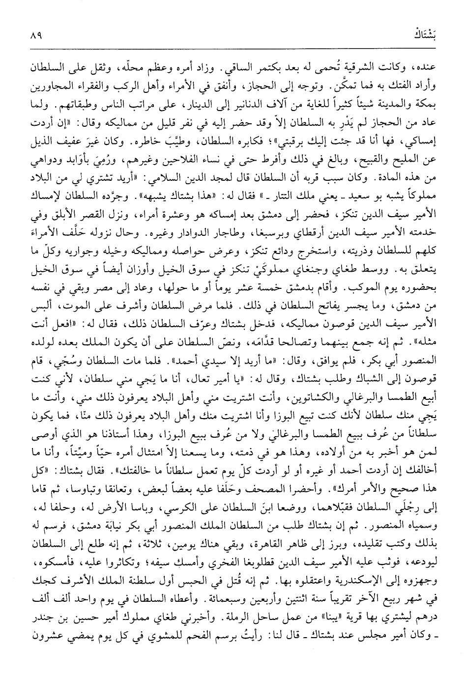 عِنْده وَكَانَت الشرقية تحمى لَهُ بعد بكتمر الساقي وَزَاد أمره وَعظم مَحَله وَثقل على السُّلْطَان وَأَرَادَ الفتك بِهِ فَمَا تمكن وَتوجه إِلَى الْحجاز وَأنْفق فِي الْأُمَرَاء وَأهل الركب والفقراء المجاورين بِمَكَّة وَالْمَدينَة شَيْئا كثيرا للغاية من آلَاف الدَّنَانِير إِلَى الدِّينَار على مَرَاتِب النَّاس وطبقاتهم وَلما عَاد من الْحجاز لم يدر بِهِ السُّلْطَان إِلَّا وَقد حضر إِلَيْهِ فِي نفر قَلِيل من مماليكه وَقَالَ إِن أردْت إمساكي فها أَنا قد جِئْت إِلَيْك برقبتي فكابره السُّلْطَان وَطيب خاطره وَكَانَ غير عفيف الذيل عَن الْمليح والقبيح وَبَالغ فِي ذَلِك وأفرط حَتَّى فِي نسَاء الفلاحين وَغَيرهم وَرمي بأوابد ودواهي من هَذِه الْمَادَّة وَكَانَ سَبَب قربه أَن السُّلْطَان قَالَ لمجد الدّين السلَامِي أُرِيد تشتري لي من الْبِلَاد مَمْلُوكا يشبه بو سعيد يَعْنِي ملك التتار فَقَالَ لَهُ هَذَا بشتاك يُشبههُ وجرده السُّلْطَان لإمساك الْأَمِير سيف الدّين تنكز فَحَضَرَ إِلَى دمشق بعد إِمْسَاكه هُوَ وَعشرَة أُمَرَاء وَنزل الْقصر الأبلق وَفِي خدمته الْأَمِير سيف الدّين أرقطاي وبرسبغا وطاجار الدوادار وَغَيره وَحَال نُزُوله حلف الْأُمَرَاء كلهم للسُّلْطَان وَذريته واستخرج ودائع تنكز وَعرض حواصله ومماليكه وخيله وجواربه وكل مَا يتَعَلَّق بِهِ ووسط)