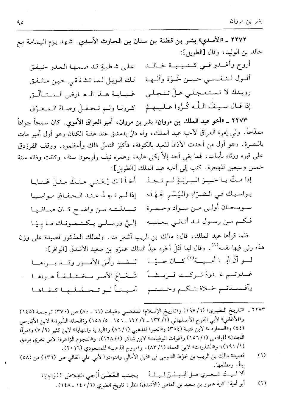 بشر بن مَرْوَان أَمِير الْعرَاق الْأمَوِي كَانَ سَمحا جواداً ممدحاً ولي إمرة الْعرَاق لِأَخِيهِ عبد الْملك وَله دَار بِدِمَشْق عِنْد عقبَة الْكَتَّان وَهُوَ أول أَمِير مَاتَ بِالْبَصْرَةِ وَهُوَ أول من أحدث الْأَذَان للعيد بِالْكُوفَةِ فأكبر النَّاس ذَلِك وأعظموه ووقف الفرزدق على قَبره ورثاه بِأَبْيَات فَمَا بَقِي أحد إِلَّا بَكَى عَلَيْهِ وعمره نَيف وَأَرْبَعُونَ سنة وَكَانَت وَفَاته سنة خمس وَسبعين لِلْهِجْرَةِ