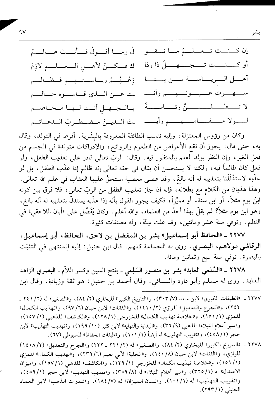 وَكَانَ من رُؤُوس الْمُعْتَزلَة وَإِلَيْهِ تنْسب الطَّائِفَة الْمَعْرُوفَة بالبشرية أفرط فِي التولد وَقَالَ بِهِ حَتَّى قَالَ يجوز أَن تقع الْأَعْرَاض من الطعوم والروائح والادراكات مُتَوَلّدَة فِي الْجِسْم من فعل الْغَيْر وَإِن النّظر يُولد الْعلم بالمنظور فِيهِ وَقَالَ الرب تَعَالَى قَادر على تَعْذِيب الطِّفْل وَلَو فعل كَانَ ظَالِما فِيهِ وَلكنه لَا يستحسن أَن يُقَال فِي حَقه تَعَالَى إِنَّه ظَالِم إِذا عذب الطِّفْل بل لَو عذبه لاستدللنا بتعذيبه لَهُ أَنه بَالغ وَقد عصى مَعْصِيّة اسْتحق عَلَيْهَا الْعقَاب فِي علم الله تَعَالَى وَهَذَا هذيان من الْكَلَام مَعَ بُطْلَانه فَإِنَّهُ إِذا جَازَ تَعْذِيب الطِّفْل من الرب تَعَالَى فَلَا فرق بَين كَونه ابْن يَوْم مثلا أَو ابْن سنة أَو مُمَيّزا فَكيف يجوز القَوْل بِأَنَّهُ إِذا عذبه يسْتَدلّ بتعذيبه لَهُ أَنه بَالغ وَهُوَ ابْن يَوْم مثلا لم يقل بِهَذَا أحد من الْعلمَاء وَالله أعلم وَكَانَ يفضل على أبان اللاحقي فِي النّظم وَتُوفِّي سنة عشر وَمِائَتَيْنِ وَقد علت سنه وَله مصنفات كَثِيرَة