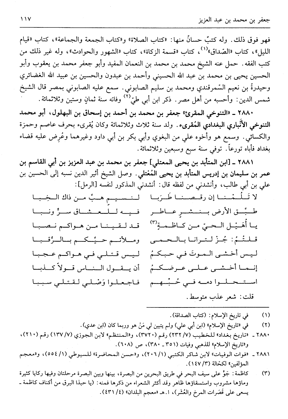 جَعْفَر بن مُحَمَّد بن عبد الْعَزِيز بن أبي الْقَاسِم بن عمر بن سُلَيْمَان بن إِدْرِيس المتأبد بن يحيى المعتلي وصل الشَّيْخ أثير الدّين نسبه إِلَى الْحُسَيْن بن عَليّ بن أبي طَالب وأنشدني من لَفظه قَالَ أَنْشدني الْمَذْكُور لنَفسِهِ من الرمل