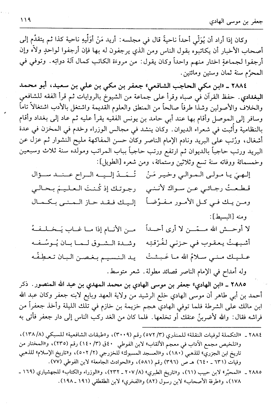 جَعْفَر بن مُوسَى الْهَادِي بن محد الْمهْدي بن عبد الله الْمَنْصُور ذكر أَحْمد بن أبي طَاهِر أَن مُوسَى الْهَادِي خلع الرشيد من ولَايَة الْعَهْد وَبَايع لِابْنِهِ جَعْفَر وَكَانَ عبد الله بن مَالك على الشرطة فَلَمَّا توفّي الْهَادِي هجم خُزَيْمَة بن خازم فِي تِلْكَ اللَّيْلَة وَأخذ جعفراً من فرَاشه فَقَالَ وَالله لأضربنَّ عُنُقك أَو تخلعها فَلَمَّا كَانَ من الْغَد ركب النَّاس إِلَى دَار جَعْفَر فَأتى بِهِ