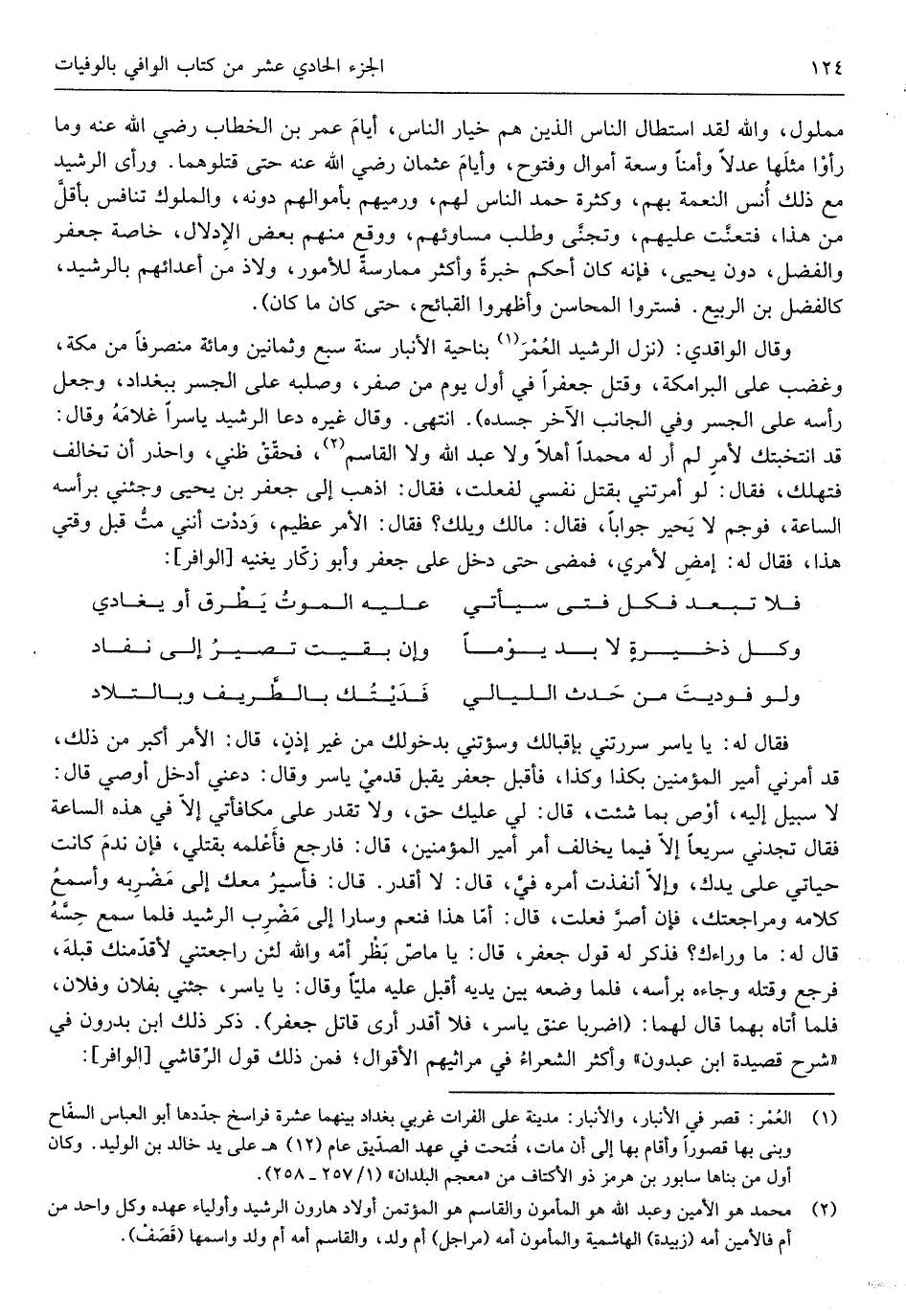 وَقَالَ والواقدي نزل الرشيد الْعُمر بِنَاحِيَة الأنبار سنة سبع وَثَمَانِينَ ومئة منرفاً من مَكَّة وَغَضب على البرامكة وَقتل جعفراً فِي أول يَوْم من صفر وصلبه على الجسر بِبَغْدَاد وَجعل رَأسه على الجسر وَفِي الْجَانِب الآخر جسده انْتهى وَقَالَ غَيره دَعَا الرشيد ياسراً غُلَامه وَقَالَ قد انتخبتك لأمر لم أر لَهُ مُحَمَّدًا أَلا وَلَا عبد الله وَلَا الْقَاسِم فحقّق ظَنِّي وَاحْذَرْ أَن تخَالف فتهلك فَقَالَ لَو أَمرتنِي بقتل نَفسِي لفَعَلت فَقَالَ اذْهَبْ إِلَى جَعْفَر بن يحيى وجئني بِرَأْسِهِ السَّاعَة فَوَجَمَ لَا يحير جَوَابا فَقَالَ مَالك وَيلك فَقَالَ الْأَمر عَظِيم وددت أنني متُّ قبل وقتي هَذَا فَقَالَ لَهُ أمض لأمري فمضي حَتَّى دخل على جَعْفَر وَأَبُو زكّار بغنيه من الوافر