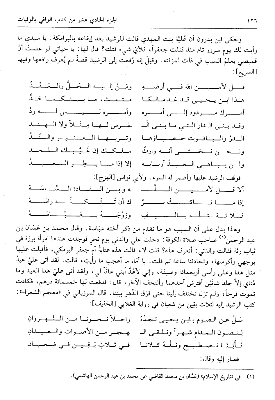 فَوقف الرشيد عَلَيْهَا وأضمر لَهُ السوء وَلأبي نواس من الهزج أَلا قل لأمين الله وَابْن القادة السَّاسه إِذا مَا ناكث سرك أَن تثكله رَأسه