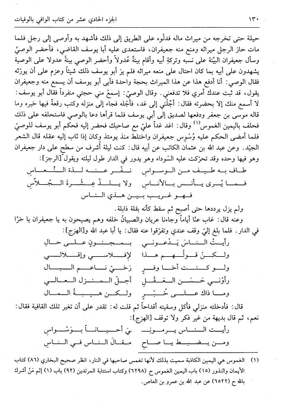 حِيلَة حَتَّى تخرجه من مِيرَاث مَاله فدلّوه على الطَّرِيق إِلَى ذَلِك فاشهد بِهِ وَأوصى إِلَى رجل فَلَمَّا مَاتَ حَاز الرجل مِيرَاثه وَمنع مِنْهُ جعيفران فاستعدى عَلَيْهِ أَبَا يُوسُف القَاضِي فأحضر الوصيَّ وَسَأَلَ جعيفران البيِّنة على نسبه وتركة أَبِيه وَأقَام بَيِّنَة عُدُولًا وأحضر الْوَصِيّ بَيِّنَة عُدُولًا على الْوَصِيَّة يشْهدُونَ على أَبِيه بِمَا كَانَ احتال على مَنعه مِيرَاثه فَلم ير أَبُو يُوسُف ذَلِك شَيْئا وعزم على أَن يورّثه فَقَالَ الْوَصِيّ أَنا أدفَع هَذَا عَن هَذَا الْمِيرَاث بِحجَّة وَاحِدَة فَأبى أَبُو يُوسُف أَن يسمع مِنْهُ وجعيفران يَقُول قد ثَبت عنْدك أَمْرِي فَلَا تدفعني وَقَالَ الوصيّ إسمع مني حجتي مُنْفَردا فَقَالَ أَبُو يُوسُف لَا اسْمَع مِنْك إِلَّا بِحَضْرَتِهِ فَقَالَ أجِّلني إِلَى غَد فأجّله فجَاء إِلَى منزله وَكتب رقْعَة فِيهَا خَبره وَمَا قَالَه مُوسَى بن جَعْفَر وَدفعهَا لصديق إِلَى أبي يُوسُف فَلَمَّا قَرَأَهَا دَعَا بالوصي فاستحلفه على ذَلِك فَحلف بِالْيَمِينِ الْغمُوس وَقَالَ اغْدُ غَدا عليّ مَعَ صَاحبك فَحَضَرَ إِلَيْهِ فَحكم أَبُو يُوسُف للوصيّ فَلَمَّا أمضى الحكم عَلَيْهِ وسوس جعيران وَاخْتَلَطَ مُنْذُ يومءذ وَكَانَ إِذا ثاب إِلَيْهِ عقله قَالَ الشّعْر الجيّد وَعَن عبد الله بن عُثْمَان الْكَاتِب عَن أَبِيه قَالَ كنت لَيْلَة أشرف من سطحٍ على دَار جعيفران وَهُوَ فِيهَا وَحده وَقد تحرّكت عَلَيْهِ السّوداء وَهُوَ يَدُور فِي الدَّار طول ليلته وَيَقُول من الرجز
