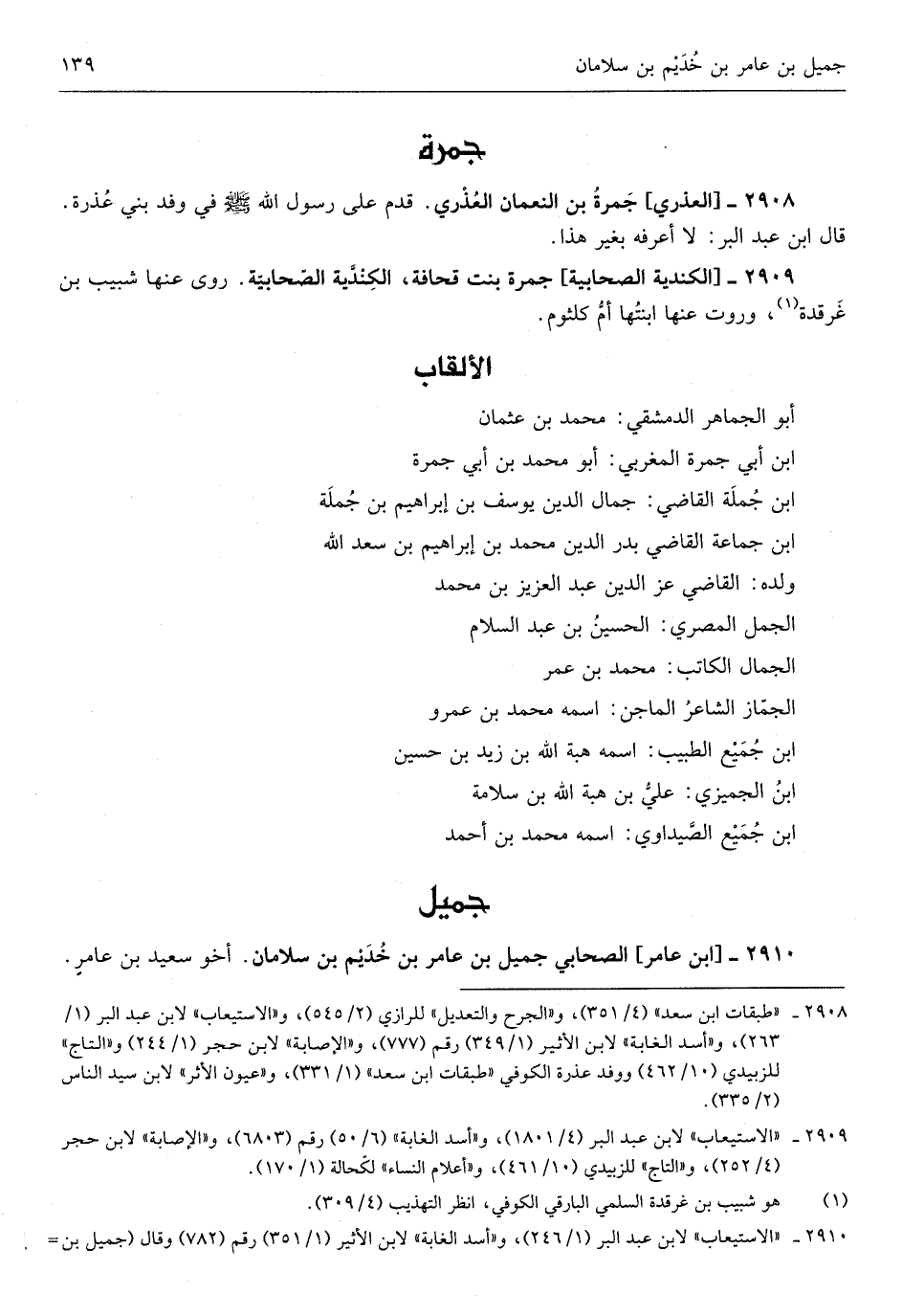 أَبُو الْجمَاهِر الدِّمَشْقِي مُحَمَّد بن عُثْمَان ابْن أبي جَمْرَة المغربي أَبُو مُحَمَّد بن أبي جَمْرَة ابْن جملَة القَاضِي جمال الدّين يُوسُف بن إِبْرَاهِيم بن جملَة ابْن جمَاعَة القَاضِي بدر الدّين مُحَمَّد بن إِبْرَاهِيم بن سعد الله وَلَده القَاضِي عز الدّين عبد الْعَزِيز بن مُحَمَّد الْجمل الْمصْرِيّ الْحُسَيْن بن عبد السَّلَام الْجمال الْكَاتِب مُحَمَّد بن عمر الجمّاز الشَّاعِر الماجن اسْمه مُحَمَّد بن عَمْرو)