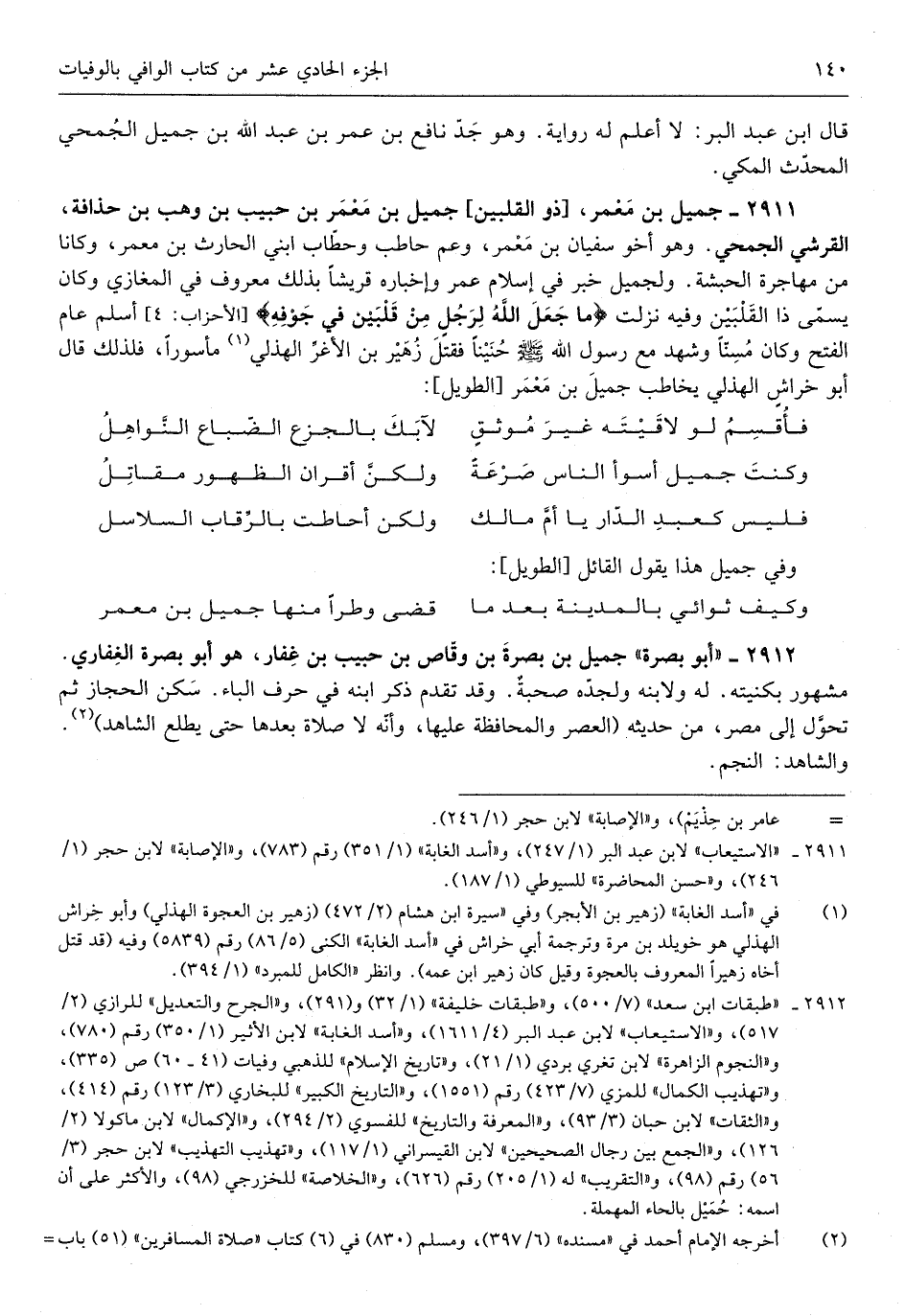 جميل بن معمر بن حبيب بن وهب بن حذافة الْقرشِي الجُمَحِي وَهُوَ أَخُو سُفْيَان بن معمر وَعم حَاطِب وحطّابابني الْحَارِث بن معمر وَكَانَا من مهاجرة الْحَبَشَة ولجميل خير فِي إِسْلَام عمر وإخباره قُريْشًا بذلك مَعْرُوف فِي الْمَغَازِي وَكَانَ يسمّى ذَا القلبين وَفِيه نزلت مَا جعل الله لرجل من قلبين فِي جَوْفه أسلم عَام الْفَتْح وَكَانَ مسناً وَشهد مَعَ رَسُول الله صلى الله عَلَيْهِ وَسلم حنيناً فَقتل زُهَيْر بن الأغرِّ الْهُذلِيّ مأسوراً فَلذَلِك قَالَ أَبُو خراشٍ الْهُذلِيّ يُخَاطب جميل بن معمر من الطَّوِيل