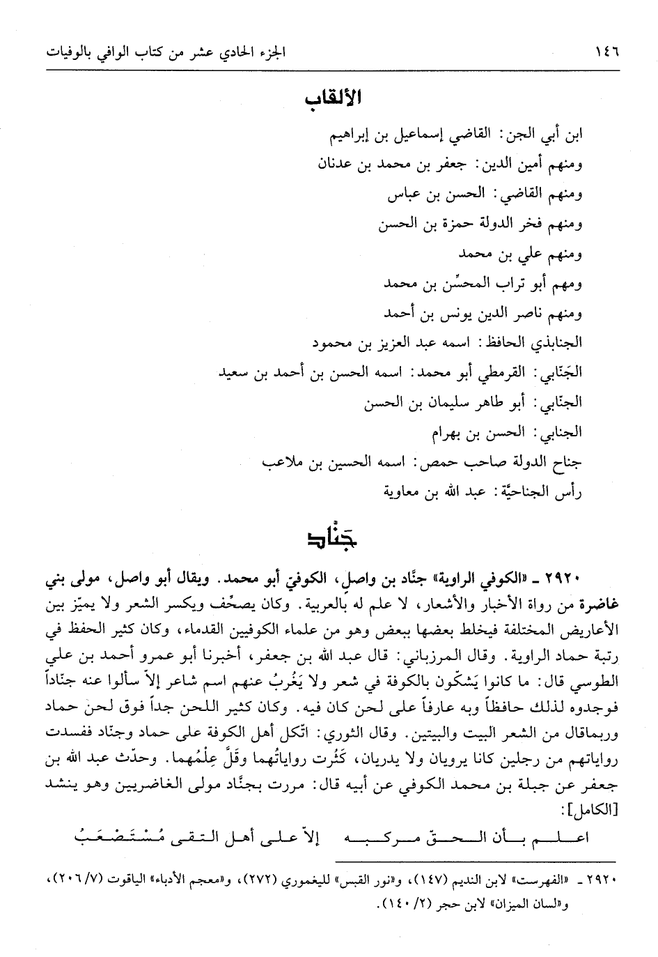 جنَّاد بن واصلٍ الكوفيّ أَبُو مُحَمَّد وَيُقَال أَبُو وَاصل مولى بني غاضرة من رُوَاة الْأَخْبَار والأشعار لَا علم لَهُ بِالْعَرَبِيَّةِ وَكَانَ يصحِّف وَيكسر الشّعْر وَلَا يميّز بَين الأعاريض الْمُخْتَلفَة فيخلط بَعْضهَا بِبَعْض وَهُوَ من عُلَمَاء الْكُوفِيّين القدماء وَكَانَ كثير الْحِفْظ فِي رُتْبَة حَمَّاد الراوية وَقَالَ المرزباني قَالَ عبد الله بن جَعْفَر أخبرنَا أَبُو عَمْرو أَحْمد بن عَليّ الطوسي قَالَ مَا كَانُوا يشكّون بِالْكُوفَةِ فِي شعر وَلَا يغرب عَنْهُم اسْم شَاعِر إلاّ سَأَلُوا عَنهُ جنّاداً فوجدوه لذَلِك حَافِظًا وَبِه عَارِفًا على لحن كَانَ فِيهِ وَكَانَ كثير اللّحن جدا فَوق لحن حَمَّاد وَرُبمَا قَالَ من الشّعْر الْبَيْت والبيتين وَقَالَ الثَّوْريّ اتّكل أهل الْكُوفَة على حَمَّاد وجنّاد ففسدت رواياتهم من رجلَيْنِ كَانَا يرويان وَلَا يدريان كثرت رواياتهما وقلَّ علمهما وحدّث عبد الله بن جَعْفَر عَن جبلة بن مُحَمَّد الْكُوفِي عَن أَبِيه قَالَ مَرَرْت بجنَّاد مولى الغاضرين وَهُوَ ينشد من الْكَامِل