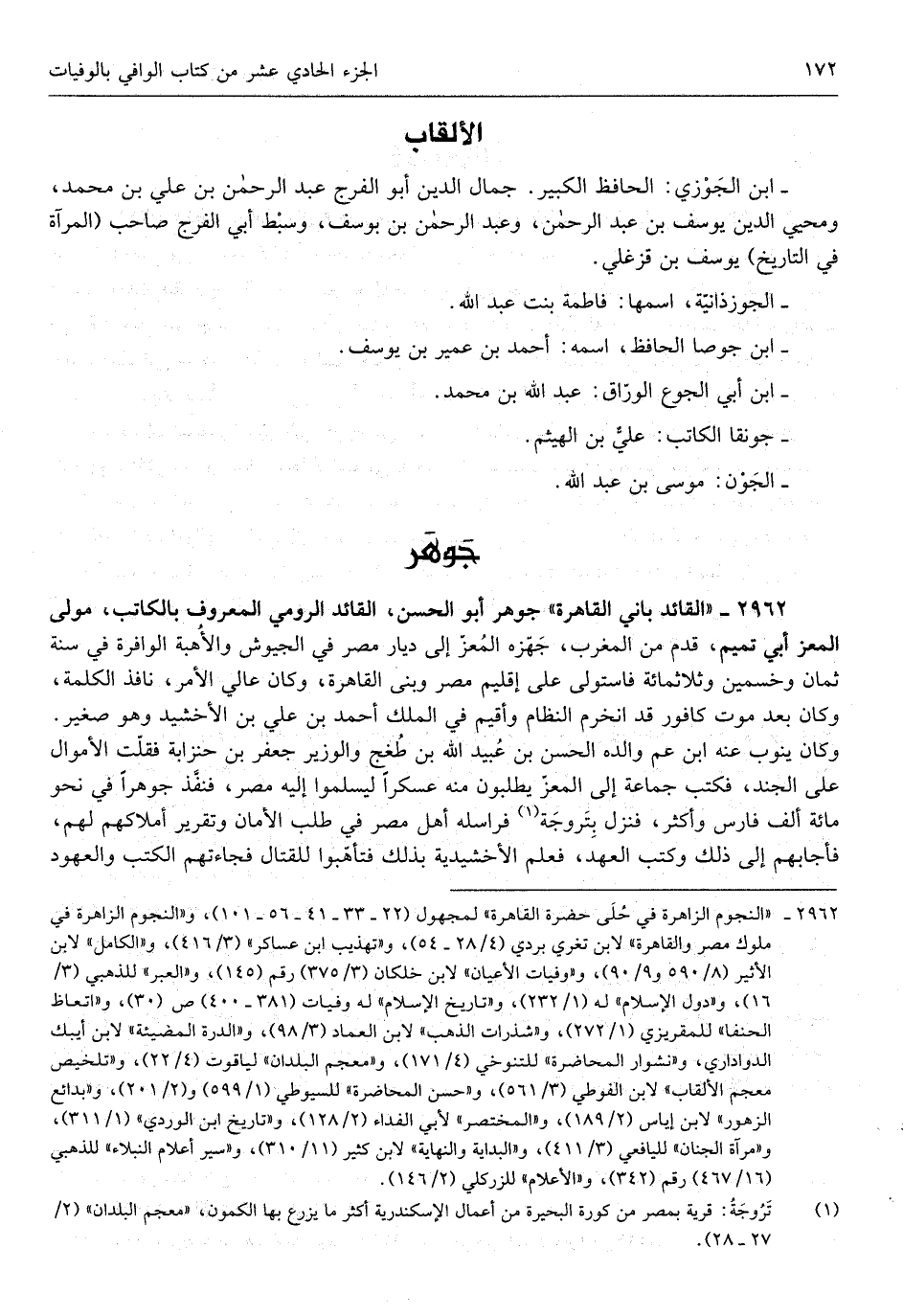 جَوْهَر أَبُو الْحسن الْقَائِد الرُّومِي الْمَعْرُوف بالكاتب مولى الْمعز أبي تَمِيم قدم من الْمغرب جهّزه المعزّ إِلَى ديار مصر فِي الجيوش والأهبة الوافرة فِي سنة ثَمَان وَخمسين وثلاثمئة فاستولى على إقليم مصر وَبنى الْقَاهِرَة وَكَانَ عالي الْأَمر نَافِذ الْكَلِمَة وَكَانَ بعد موت كافور قد انخرم النظام وأقيم فِي الْملك أَحْمد بن عَليّ بن الأخشيد وَهُوَ صَغِير وَكَانَ يَنُوب عَنهُ ابْن عَم وَالِده الْحسن بن عبيد الله بن طغج والوزير جَعْفَر بن حنزابة فقلّت الْأَمْوَال على الْجند فَكتب جمَاعَة إِلَى المعزّ يطْلبُونَ مِنْهُ عسكراً ليسلموا إِلَيْهِ مصر فنفَّذ جوهراً فِي نَحْو مئة ألف فَارس وَأكْثر فَنزل بتروجة فراسله أهل مصر فِي طلب الْأمان وَتَقْرِير أملاكهم لَهُم فأجابهم إِلَى ذَلِك وَكتب الْعَهْد فَعلم الأخشيدية بذلك فتأهّبوا لِلْقِتَالِ فجاءتهم الْكتب والعهود