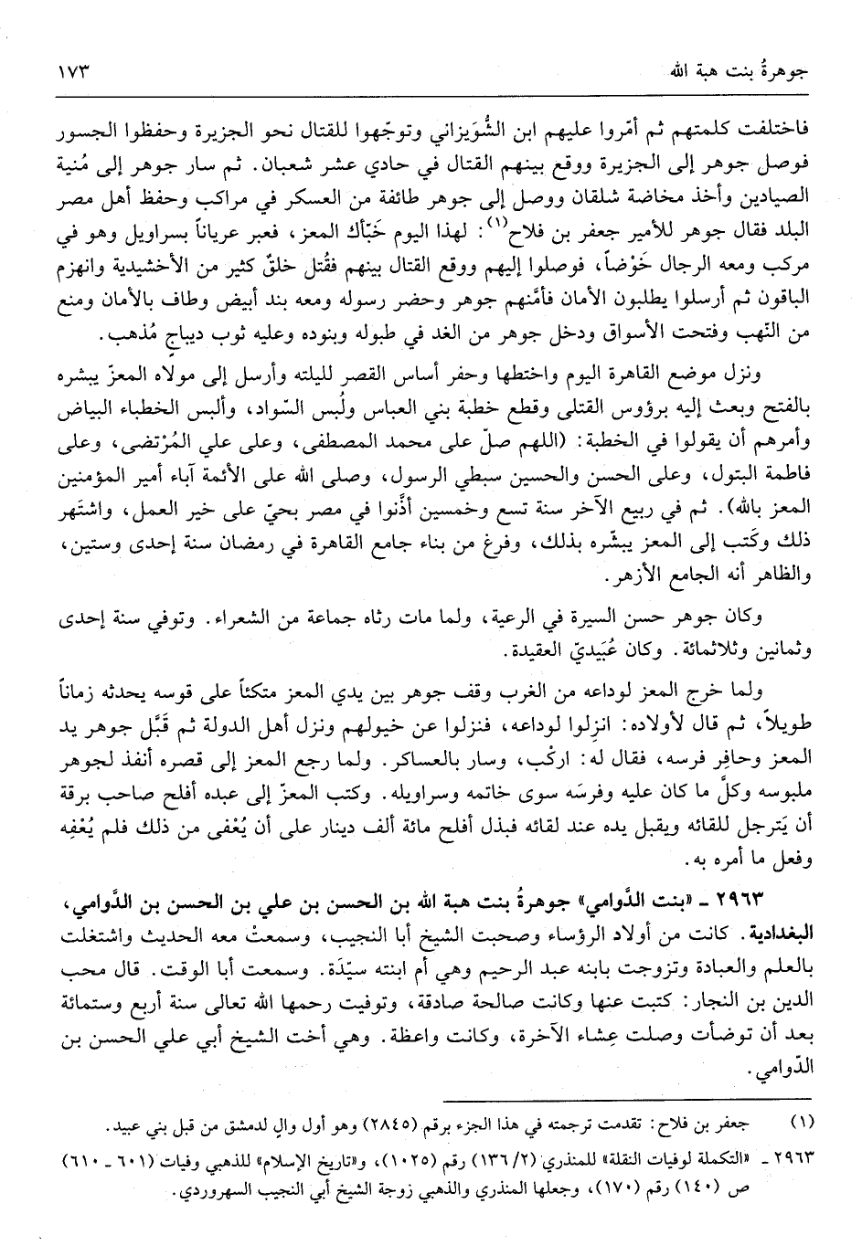 جَوْهَرَة بنت هبة الله بن الْحسن بن عَليّ بن الْحسن بن الدَّوامي البغدادية كَانَت من أَوْلَاد الرؤساء وصحبت الشَّيْخ أَبَا النجيب وَسمعت مَعَه الحَدِيث واشتغلت بِالْعلمِ وَالْعِبَادَة وَتَزَوَّجت بِابْنِهِ عبد الرَّحِيم وَهِي أم ابْنَته سيّدة وَسمعت أَبَا الْوَقْت قَالَ محب الدّين بن النجار كتبت عَنْهَا وَكَانَت صَالِحَة صَادِقَة وَتوفيت رَحمهَا الله تَعَالَى سنة أَربع وستمئة بعد أَن تَوَضَّأت وصلت عشَاء الْآخِرَة وَكَانَت واعظة وَهِي أُخْت الشَّيْخ أبي عَليّ الْحسن بن الدّوامي