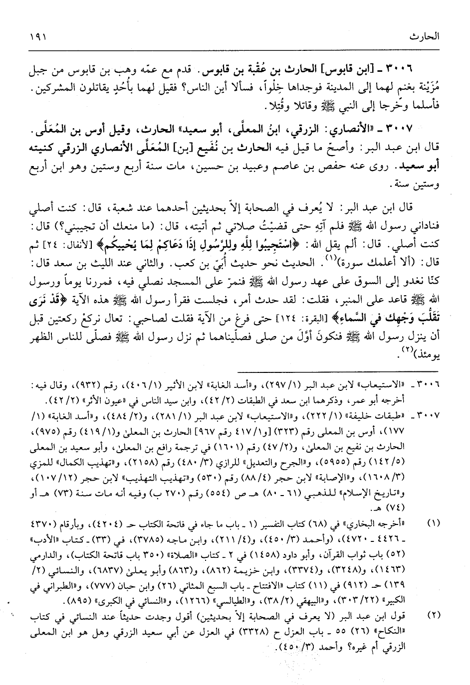 قَالَ ابْن عبد الْبر لَا يعرف فِي الصَّحَابَة إلاّ بحديثين أَحدهمَا عِنْد شُعْبَة قَالَ كنت أُصَلِّي فناداني رَسُول الله صلى الله عَلَيْهِ وَسلم آته حَتَّى قضيت صَلَاتي ثمَّ أَتَيْته قَالَ مَا مَنعك أَن تُجِيبنِي قَالَ كنت أُصَلِّي قَالَ ألم يقل الله اسْتجِيبُوا لله وللرَّسول إِذا دعَاكُمْ لما يُحْيِيكُمْ ثمَّ قَالَ أَلا أعلمك سُورَة الحَدِيث نَحْو حَدِيث أبي بن كَعْب وَالثَّانِي عِنْد اللَّيْث بن سعد قَالَ كنّا نغدو إِلَى السُّوق على عهد رَسُول الله صلى الله عَلَيْهِ وَسلم فنمرّ على الْمَسْجِد نصلي فِيهِ فمررنا يَوْمًا وَرَسُول الله صلى الله عَلَيْهِ وَسلم قَاعد على الْمِنْبَر فَقلت لقد حدث أَمر فَجَلَست فَقَرَأَ رَسُول الله صلى الله عَلَيْهِ وَسلم الْآيَة قد نرى تقلُّب وَجهك فِي السَّماء حَتَّى فرغ من الْآيَة فَقلت لصاحبي تعال نركع رَكْعَتَيْنِ قبل أَن ينزل رَسُول الله صلى الله عَلَيْهِ وَسلم فنكون أوَّل من صلى فصلّينا هما ثمَّ نزل رَسُول الله صلى الله عَلَيْهِ وَسلم فصلّى للنَّاس الظّهْر يَوْمئِذٍ