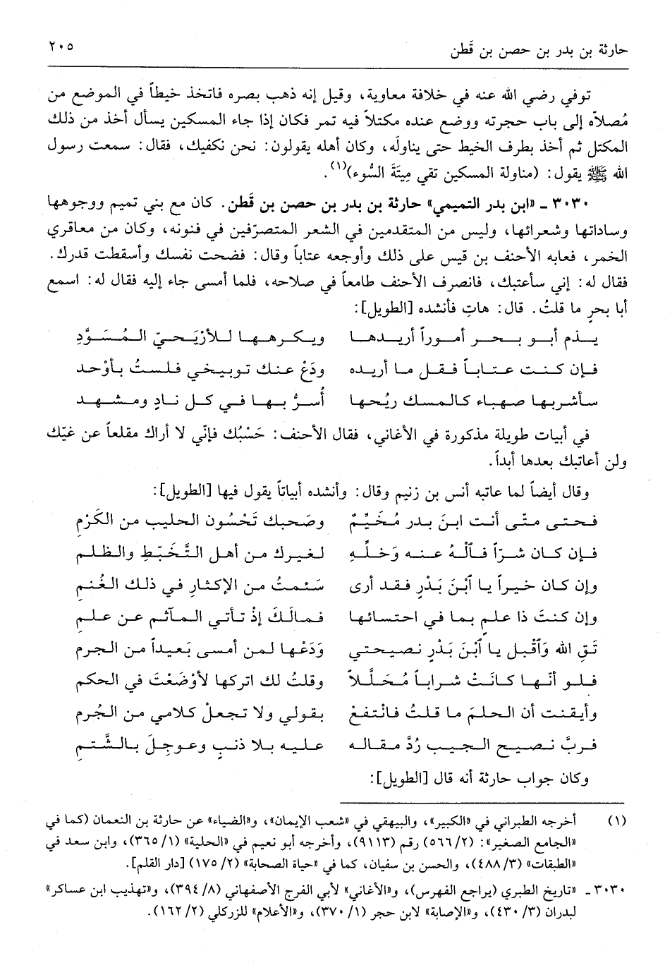 حَارِثَة بن بدر بن حصن بن قطن كَانَ مَعَ بني تَمِيم ووجوهها وساداتها وشعرائها وَلَيْسَ من الْمُتَقَدِّمين فِي الشّعْر المتصرفّين فِي فنونه وَكَانَ من معاقري الْخمر فعابه الْأَحْنَف بن قيس على ذَلِك وأوجعه عتاباً وَقَالَ فضحت نَفسك وأسقطت قدرك فَقَالَ لَهُ إِنِّي سأعتبك فَانْصَرف الْأَحْنَف طامعاً فِي صَلَاحه فَلَمَّا أَمْسَى جَاءَ إِلَيْهِ فَقَالَ لَهُ إسمع أَبَا بحرٍ مَا قلت قَالَ هَات فأنشده من الطَّوِيل