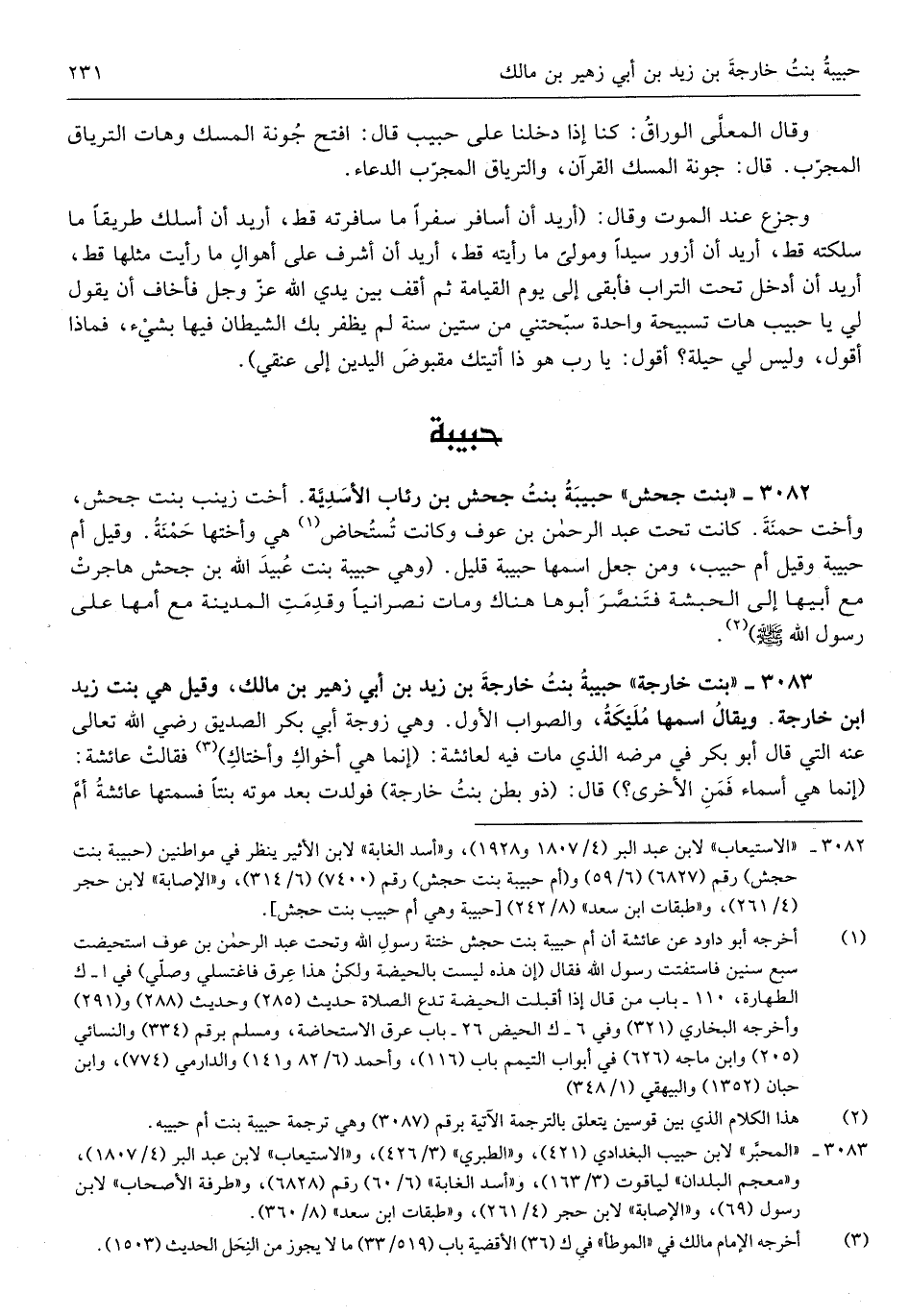 حَبِيبَة بنت جحس بن رِئَاب الأسديَّة أُخْت زينت بنت جحش وَأُخْت حمْنَة كَانَت تَحت عبد الرَّحْمَن بن عَوْف وَكَانَت تستحاض هِيَ وَأُخْتهَا حمْنَة وَقيل أم حَبِيبَة وَقبل أم حبيب وَمن جعل اسْمهَا حَبِيبَة قَلِيل وَهِي حَبِيبَة بنت عبيد الله بن جحش هَاجَرت مَعَ أَبِيهَا إِلَى الْحَبَشَة فتنصَّر أَبوهَا هُنَاكَ وَمَات نَصْرَانِيّا وقدمت الْمَدِينَة مَعَ أمهَا على رَسُول الله صلى الله عَلَيْهِ وَسلم