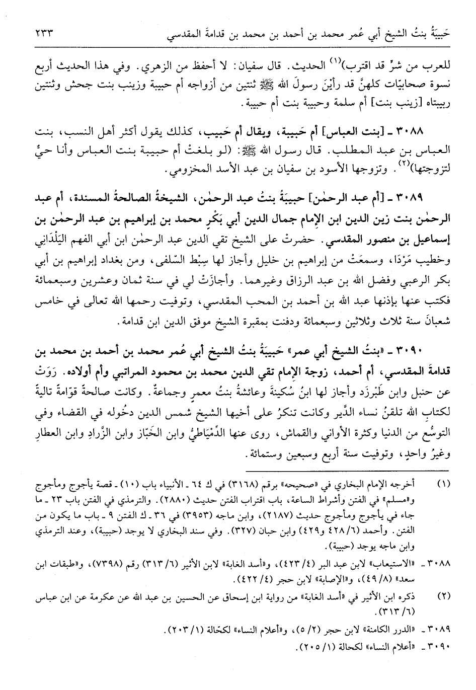 حَبِيبَة بنت عبد الرَّحْمَن الشيخة الصَّالِحَة المسندة أم عبد الرَّحْمَن بنت زين الدّين ابْن الإِمَام جمال الدّين أبي بكرٍ بن إِبْرَاهِيم بن عبد الرَّحْمَن بن إِسْمَاعِيل بن مَنْصُور الْمَقْدِسِي حضرت على الشَّيْخ تَقِيّ الدّين عبد الرَّحْمَن ابْن أبي الْفَهم اليلداني وخطيب مردا وَسمعت من إِبْرَاهِيم بن خَلِيل وَأَجَازَ لَهَا سبط السّلفي وَمن بَغْدَاد إِبْرَاهِيم بن أبي بكر الرعبي وَفضل الله بن عبد الرَّزَّاق وَغَيرهمَا وأجازت لي فِي سنة ثَمَان وَعشْرين وسبعمئة فَكتب عَنْهَا فإذنها عبد الله بن أَحْمد بن المحبِّ الْمَقْدِسِي وَتوفيت رَحمهَا الله تَعَالَى فِي خَامِس شعْبَان سنة ثَلَاث وَثَلَاثِينَ)