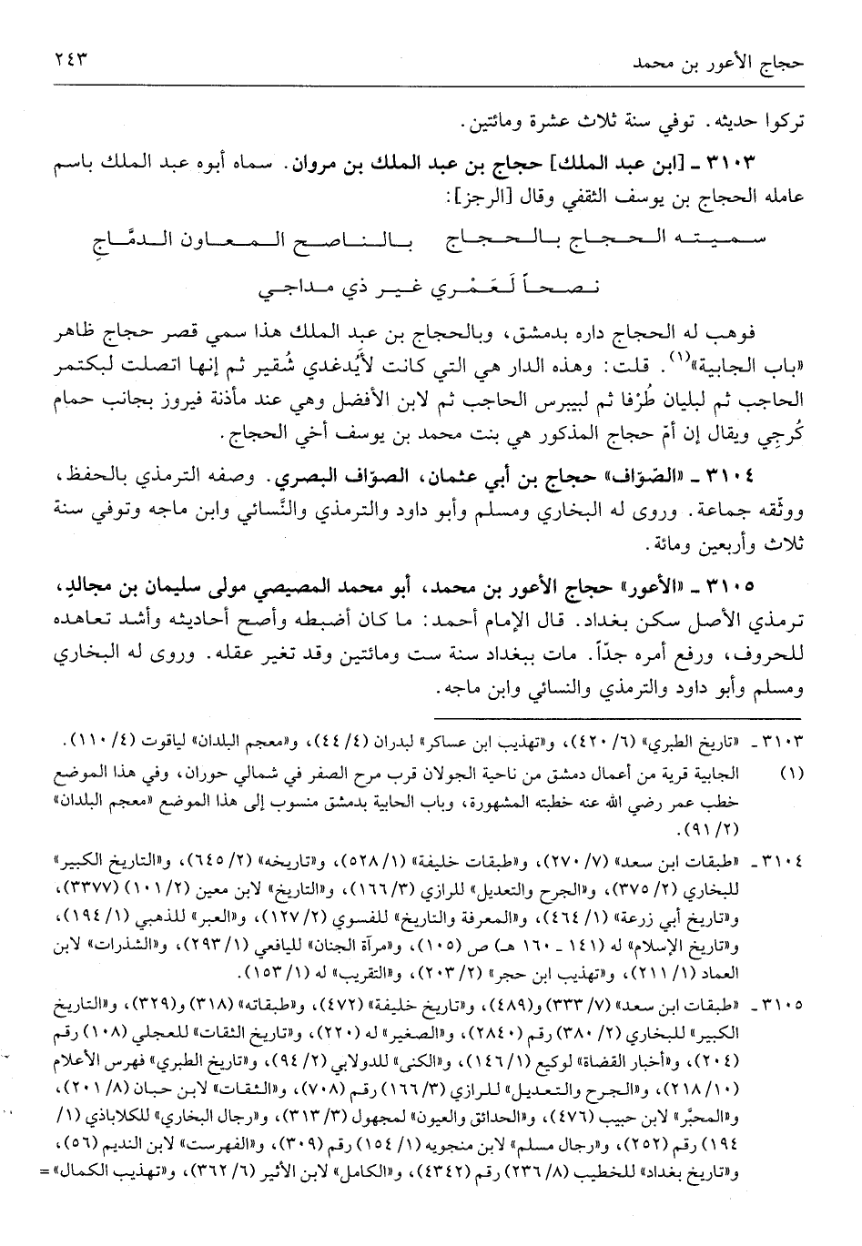 حجاج الْأَعْوَر بن مُحَمَّد أَبُو مُحَمَّد المصِّيصِي مولى سُلَيْمَان بن مجالدٍ ترمذي الأَصْل سكن بَغْدَاد قَالَ الإِمَام أَحْمد مَا كَانَ أضبطه وَأَصَح أَحَادِيثه وَأَشد تعاهده للحروف وَرفع أمره جدّاً مَاتَ بِبَغْدَاد سنة سِتّ ومئتين وَقد تغيرعقله وروى لَهُ