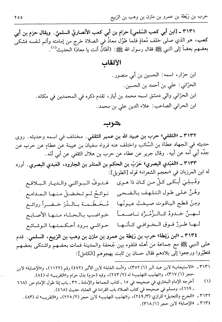 حرَام بن أبي كَعْب الأنصاريُّ السلميُّ وَيُقَال حزم بن أبي كَعْب هُوَ الَّذِي صلى خلف معاذٍ فَلَمَّا طوَّل معاذٌ فِي الصَّلَاة خرج من إِمَامَته وَأتم لنَفسِهِ فَشكى بَعضهم بَعْضًا إِلَى النَّبِي صلى الله عَلَيْهِ وَسلم أفتّانٌ أَنْت يَا معَاذ الحَدِيث