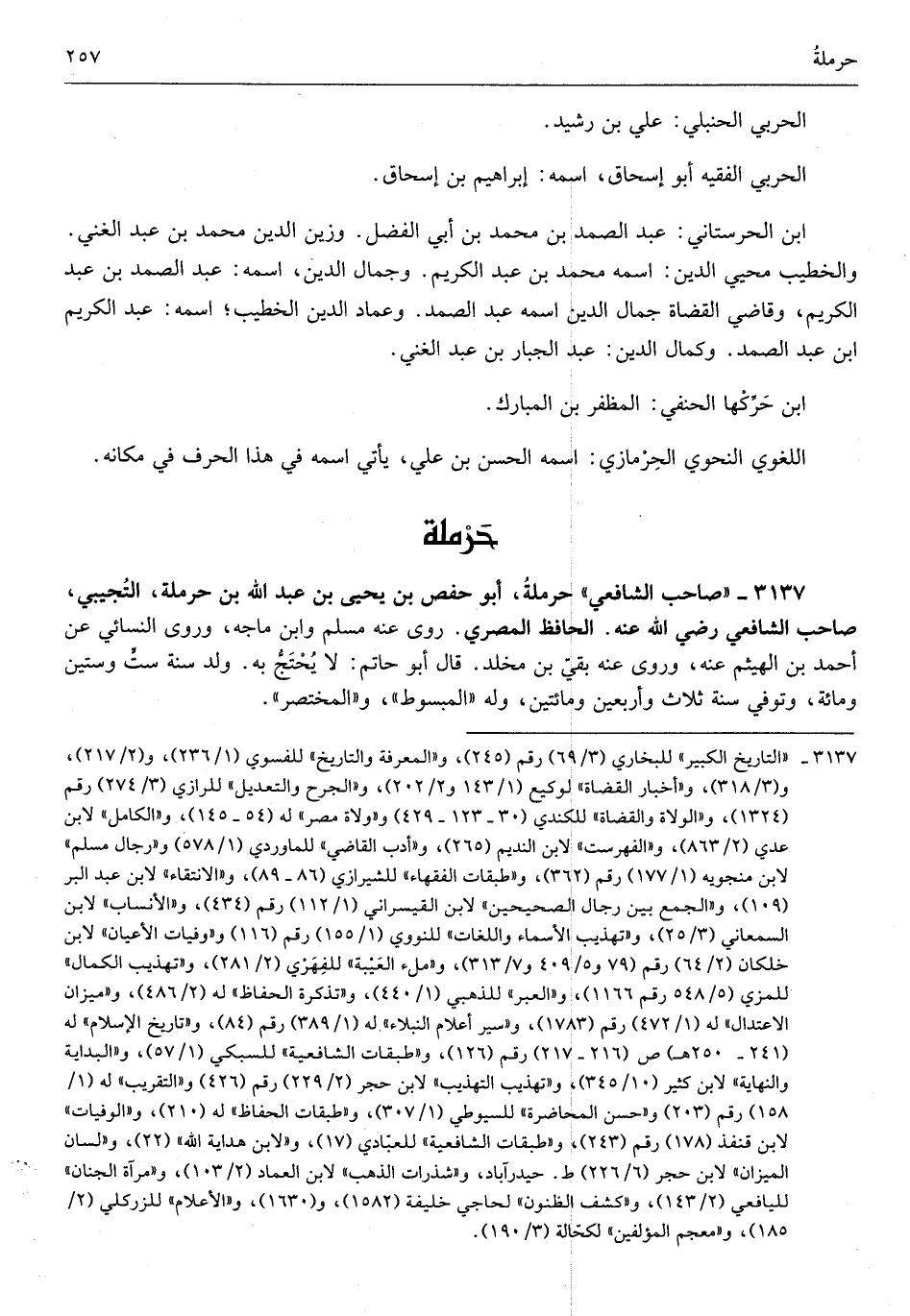 حَرْمَلَة أَبُو حَفْص بن يحيى بن عبد الله بن حَرْمَلَة التجِيبِي صَاحب الشَّافِعِي رَضِي الله عَنهُ الْحَافِظ الْمصْرِيّ روى عَنهُ مُسلم وَابْن ماجة وروى النَّسَائِيّ عَن أَحْمد بن الْهَيْثَم عَنهُ ورورى عَنهُ بقيّ بن مخلد قَالَ أَبُو حَاتِم لَا يحتجُّ بِهِ ولد
