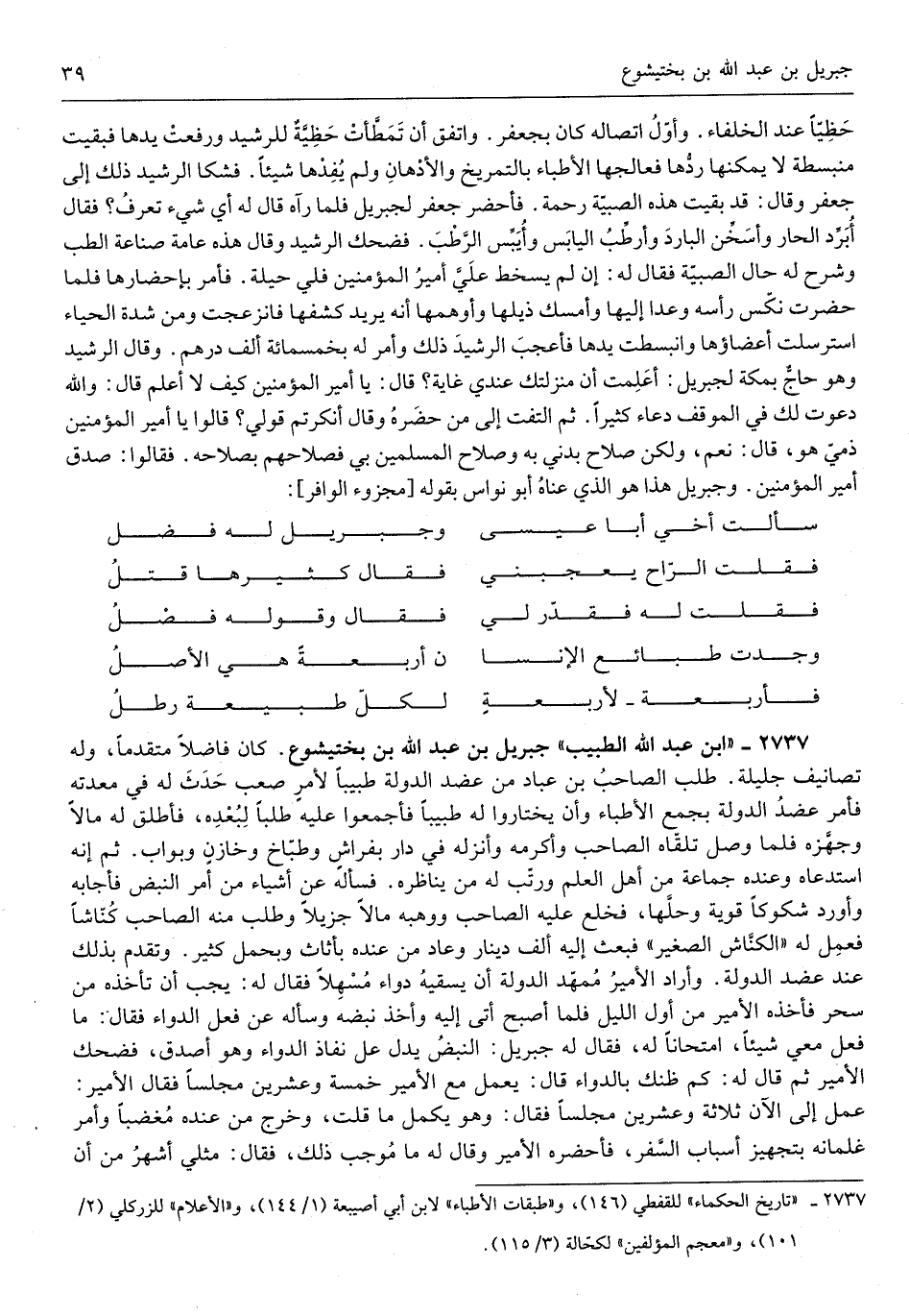 وَتقدم بذلك عِنْد عضد الدولة وَأَرَادَ الْأَمِير ممهد الدولة أَن يسْقِيه دَوَاء مسهلاً فَقَالَ لَهُ يجب أَن تَأْخُذهُ من سحر فَأَخذه الْأَمِير من أول اللَّيْل فَلَمَّا أصبح أَتَى إِلَيْهِ وَأخذ نبضه وَسَأَلَهُ عَن فعل الدَّوَاء فَقَالَ مَا فعل معي شَيْئا امتحاناً لَهُ فَقَالَ لَهُ جِبْرِيل النبض يدل على نَفاذ الدَّوَاء وَهُوَ أصدق فَضَحِك الْأَمِير ثمَّ قَالَ لَهُ كم ظَنك بالدواء قَالَ يعْمل مَعَ الْأَمِير خَمْسَة وَعشْرين مَجْلِسا فَقَالَ الْأَمِير عمل إِلَى الْآن ثَلَاثَة وَعشْرين مَجْلِسا فَقَالَ وَهُوَ يكمل مَا قلت وَخرج من عِنْده مغضباً وَأمر غلمانه بتجهيز أَسبَاب السّفر فَأحْضرهُ الْأَمِير وَقَالَ لَهُ مَا مُوجب ذَلِك فَقَالَ مثلي أشهر من أَن