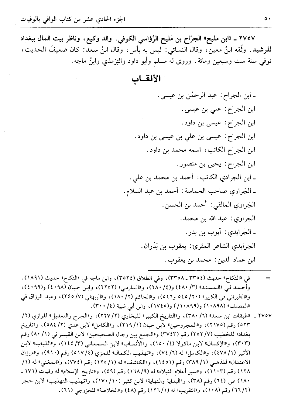 ابْن الْجراح عبد الرَّحْمَن بن عِيسَى ابْن الْجراح عَليّ بن عِيسَى ابْن الْجراح عِيسَى بن دَاوُد ابْن الْجراح عِيسَى بن عَليّ بن عِيسَى بن دَاوُد ابْن الْجراح الْكَاتِب اسْمه مُحَمَّد بن دَاوُد ابْن الْجراح يحيى بن مَنْصُور ابْن الجرادي الْكَاتِب أجمد بن مُحَمَّد بن عَليّ الجراوي صَاحب الحماسة أَحْمد بن عبد السَّلَام الجراوي المالقي أَحْمد بن الْحسن)