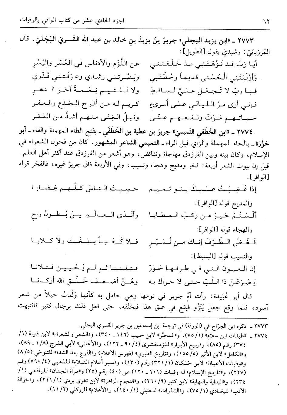 جرير بن عَطِيَّة بن الخطفي بِفَتْح الطَّاء الْمُهْملَة وَالْفَاء أَبُو حزرة بِالْحَاء الْمُهْملَة وَالزَّاي قبل الرَّاء التَّمِيمِي الشَّاعِر الْمَشْهُور كَانَ من فحول الشُّعَرَاء فِي الْإِسْلَام وَكَانَ بَينه وَبَين الفرزدق مهاجاة ونقائض وَهُوَ أشعر من الفرزدق عِنْد أَكثر أهل الْعلم