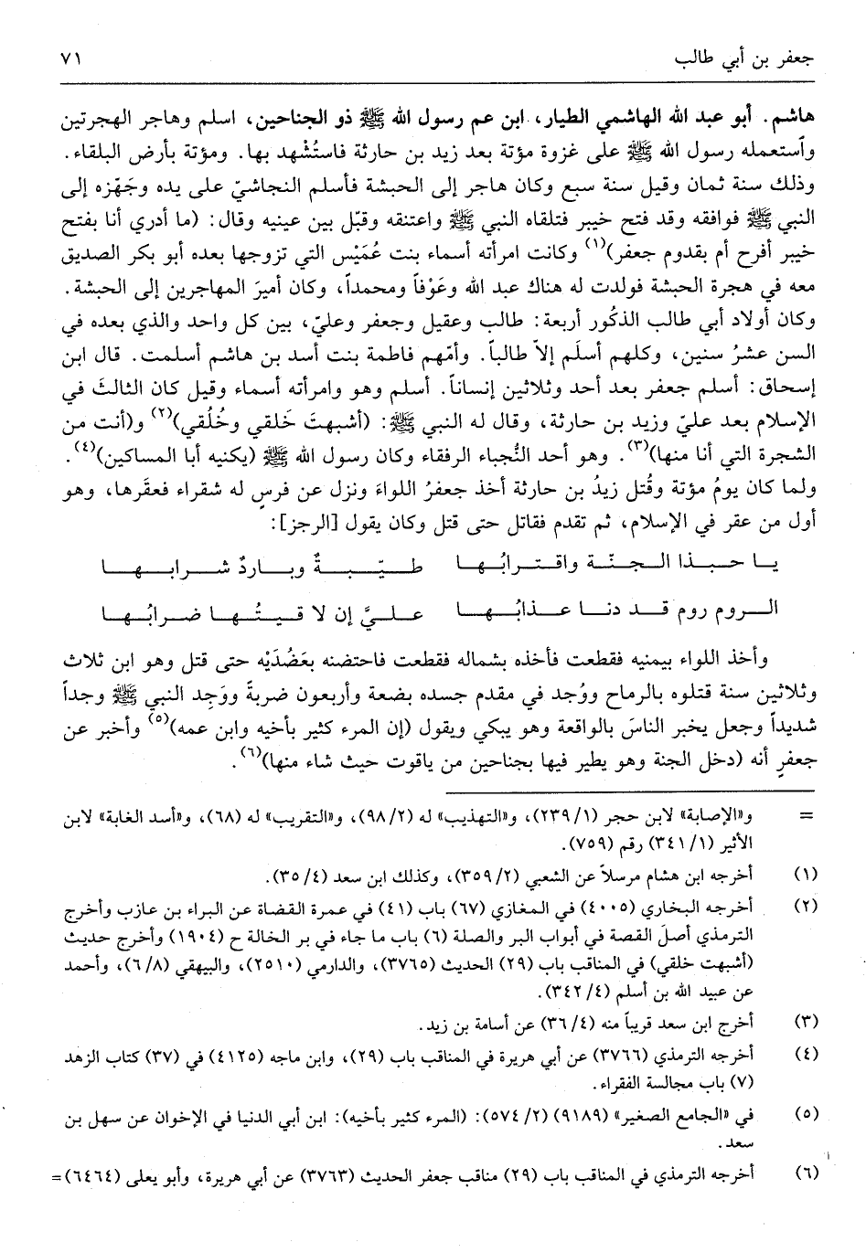 هَاشم أَبُو عبد الله الْهَاشِمِي الطيار ابْن عَم رَسُول الله صلى الله عَلَيْهِ وَسلم ذُو الجناحين اسْلَمْ وَهَاجَر الهجرتين وَاسْتَعْملهُ رَسُول الله صلى الله عَلَيْهِ وَسلم على غَزْوَة مُؤْتَة بعد زيد بن حَارِثَة فاستشهد بهَا