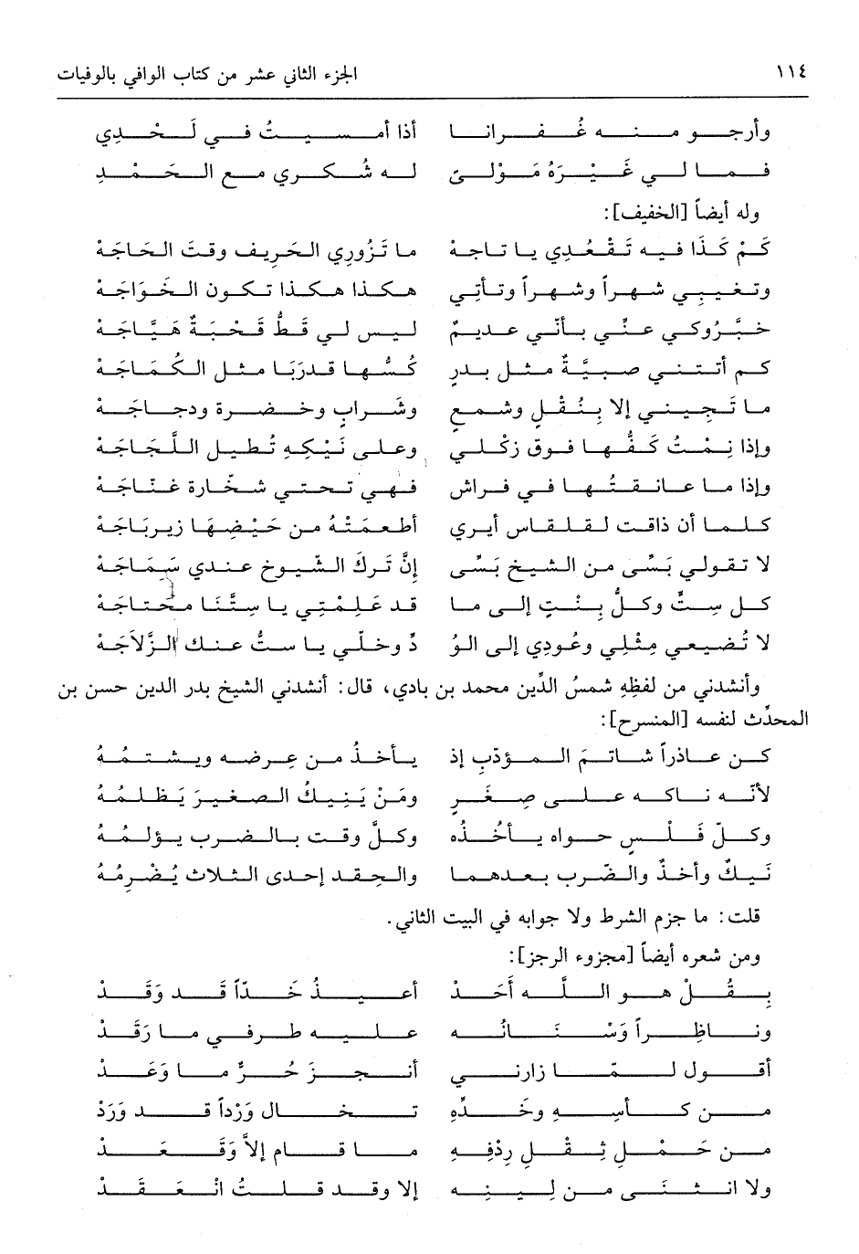 لَا تضيعي مثلي وعودي إِلَى الووخلي يَا سِتّ عَنْك الزلاجه وأنشدني من لَفظه شمس الدّين مُحَمَّد بن بَادِي قَالَ أَنْشدني الشَّيْخ بدر الدّين حسن بن الْمُحدث لنَفسِهِ من المنسرح