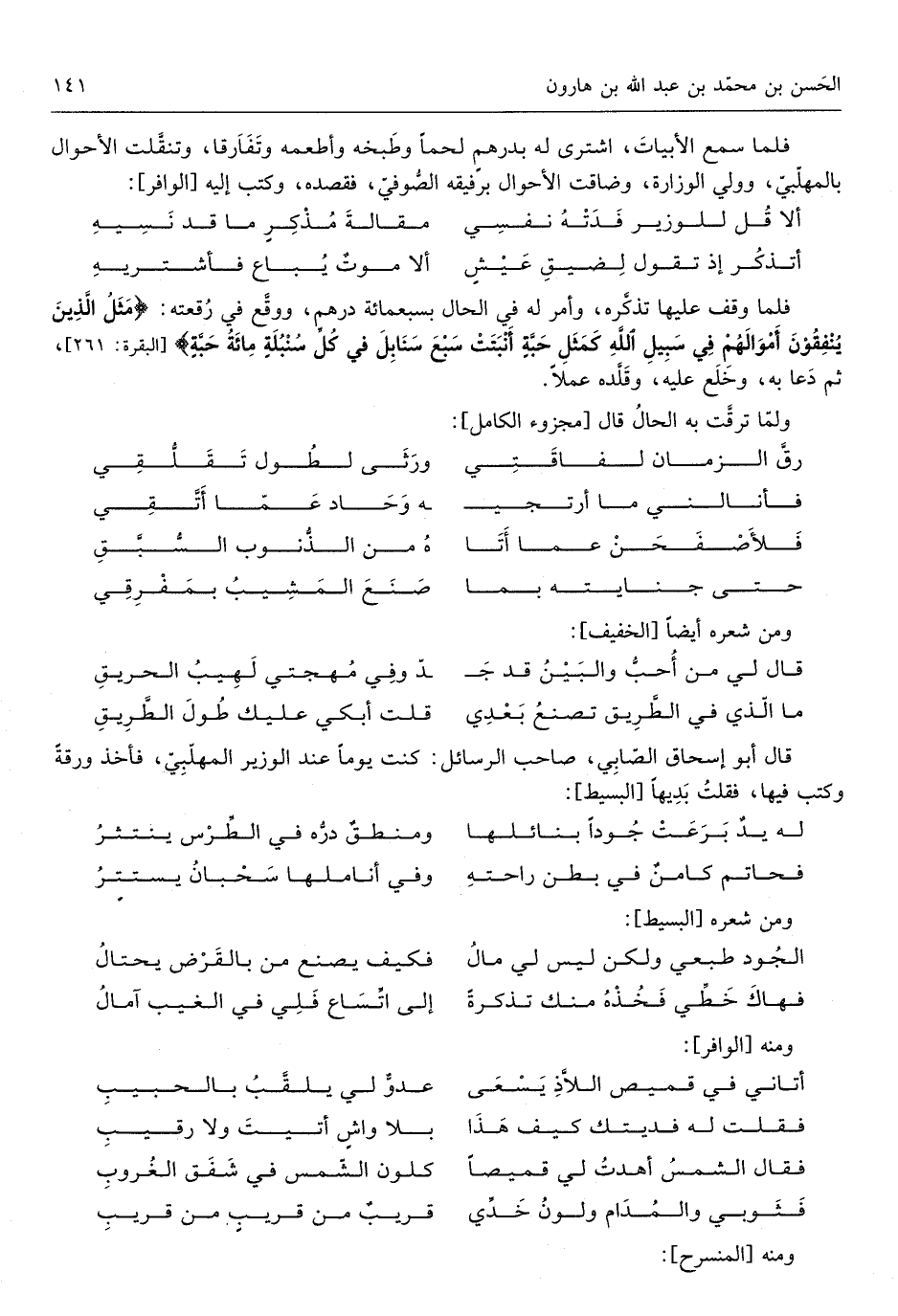 فَلَمَّا سمع الأبيات اشْترى لَهُ بدرهمٍ لَحْمًا وطبخه وأطعمه وتفارقا وتنقلت الْأَحْوَال بالمهلبي وَولي الوزارة وَضَاقَتْ الْأَحْوَال برفيقه الصُّوفِي فقصده وَكتب إِلَيْهِ من الوافر