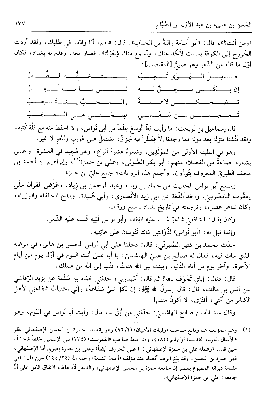 وَسمع أَبُو نواس الحَدِيث من حَمَّاد بن زيد وَعبد الرَّحْمَن بن زِيَاد وَعرض الْقُرْآن على يَعْقُوب الْحَضْرَمِيّ وَأخذ اللُّغَة عَن أبي زيد الْأنْصَارِيّ وَأبي عُبَيْدَة ومدح الْخُلَفَاء والوزراء وَكَانَ شَاعِر عصره وترجمته فِي تَارِيخ بَغْدَاد سبع وَرَقَات